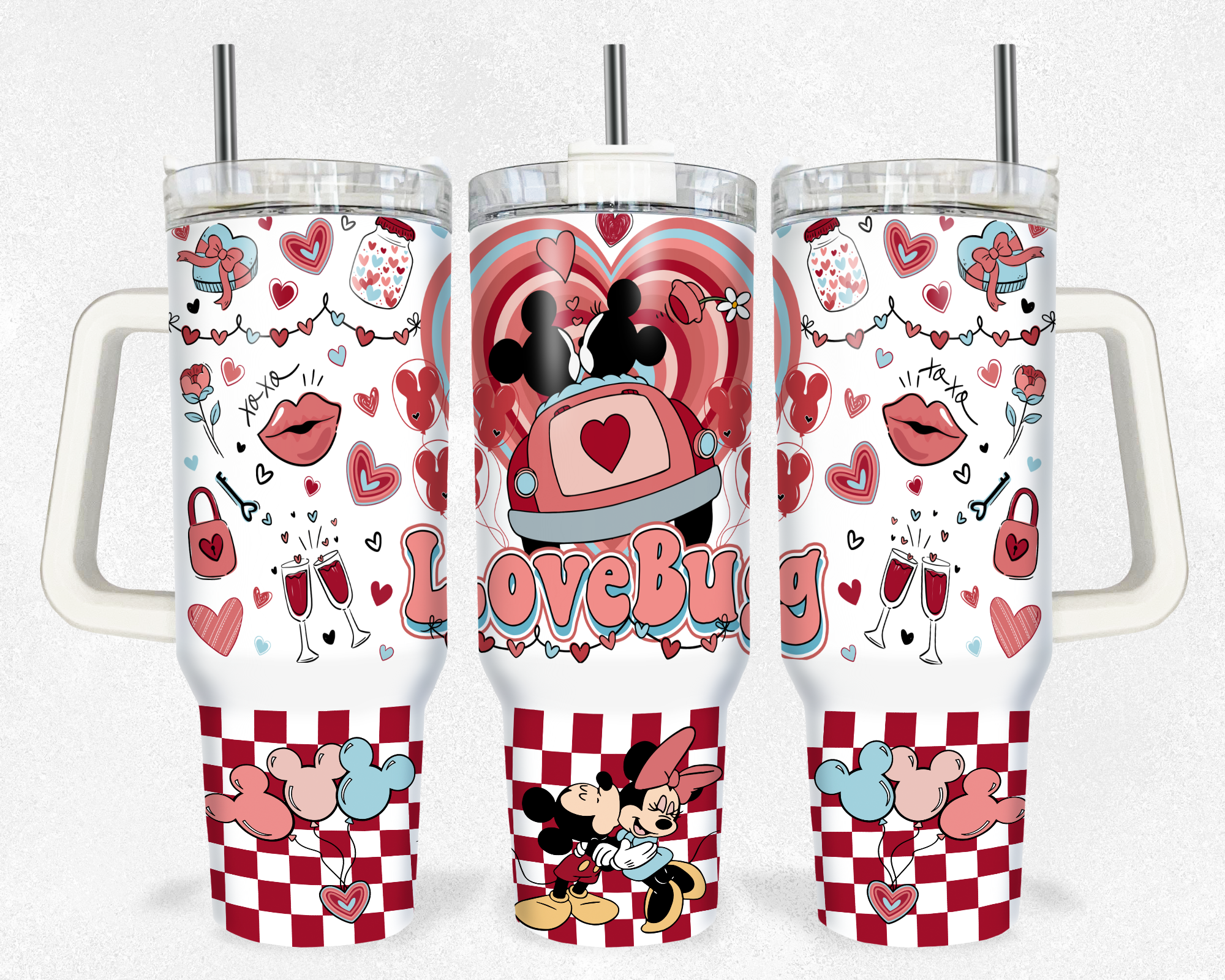 Sip in style with this adorable LoveBug tumbler featuring a charming couple design. Perfect for any beverage, it includes a convenient handle and straw.