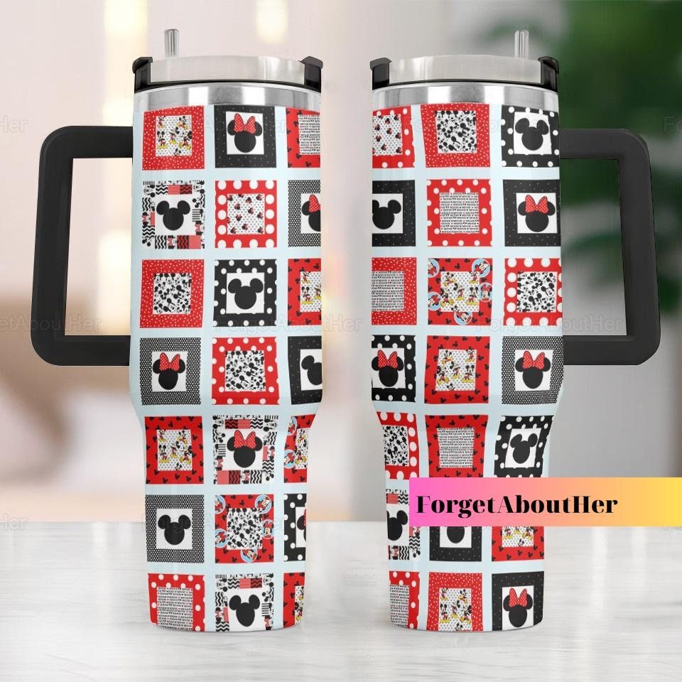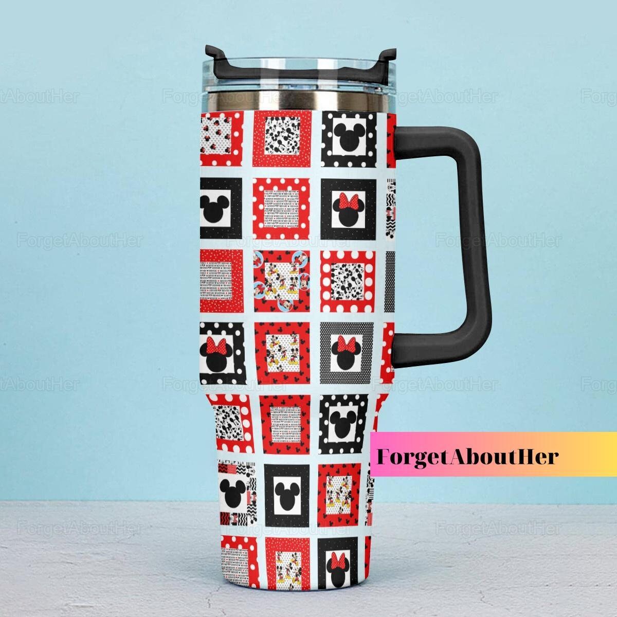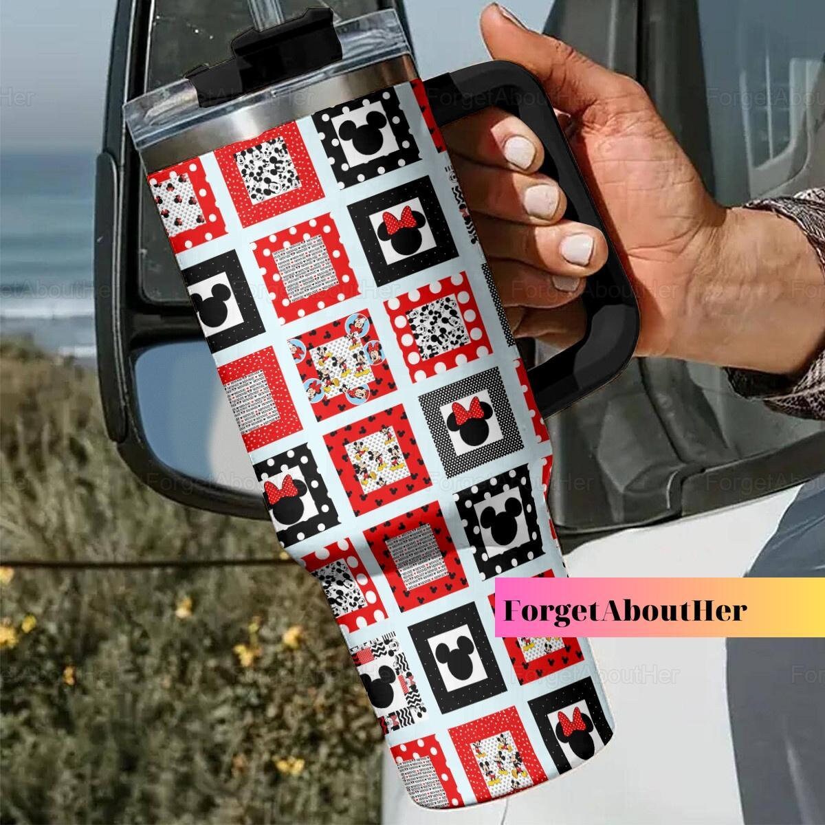 Stay stylish on the go with this Disney-inspired travel mug, featuring vibrant red and black patterns. Perfect for Disney lovers!
