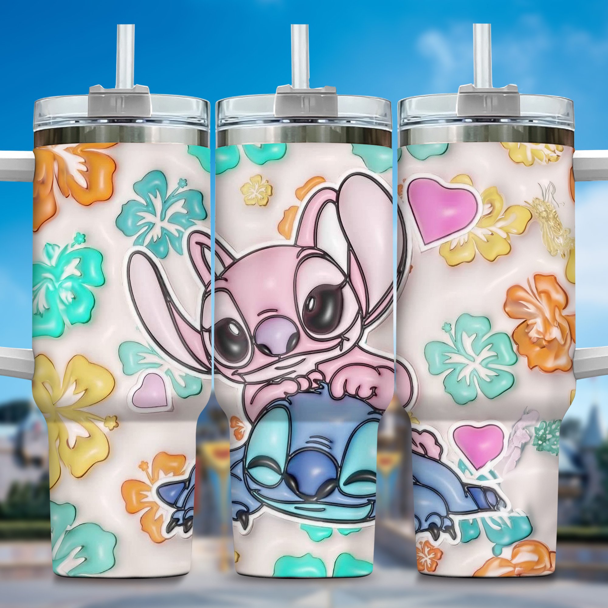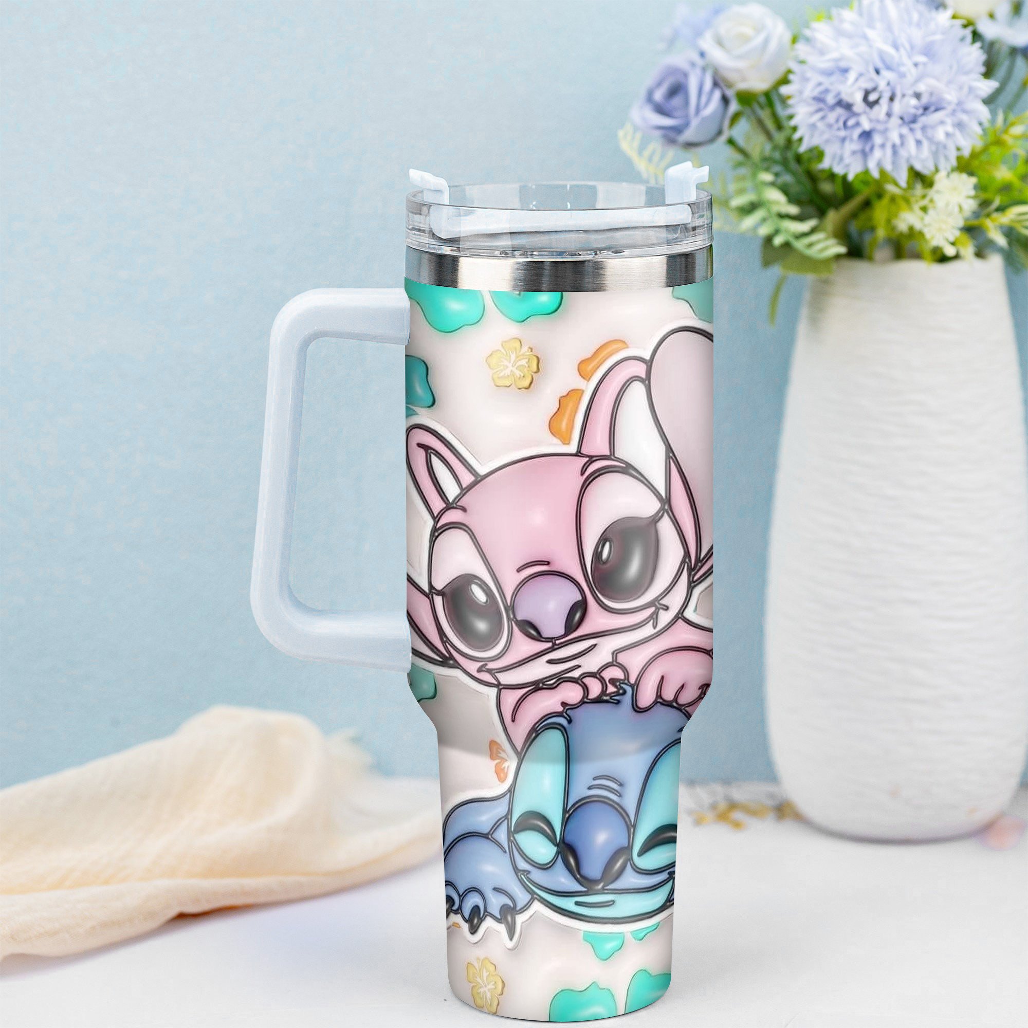 Keep your drinks at the perfect temperature with this vibrant tumbler featuring a cute character and floral design. Ideal for on-the-go refreshment.