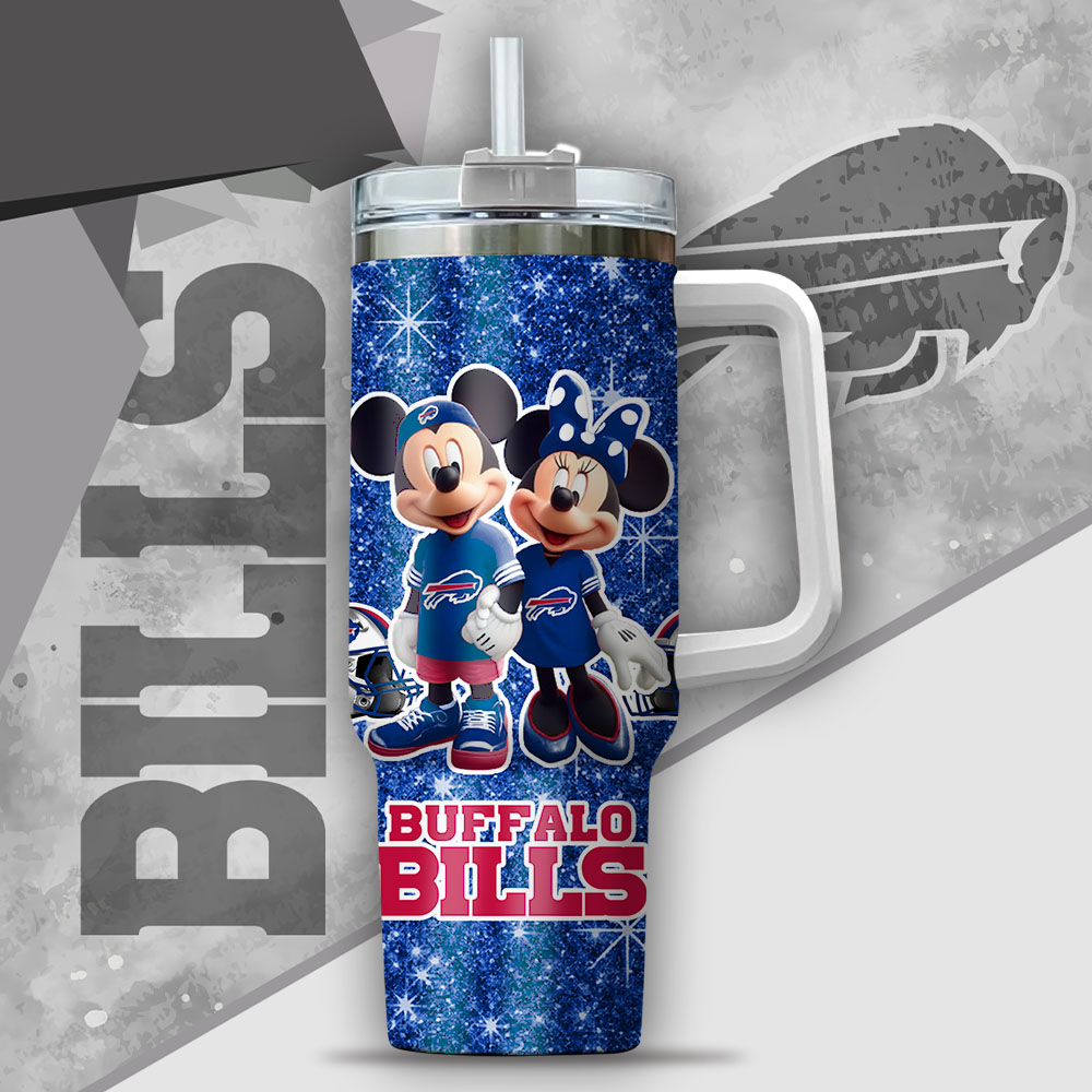 Show off your team spirit with this personalized Disney tumbler featuring Mickey and Minnie in Buffalo Bills gear. Perfect for fans on the go!