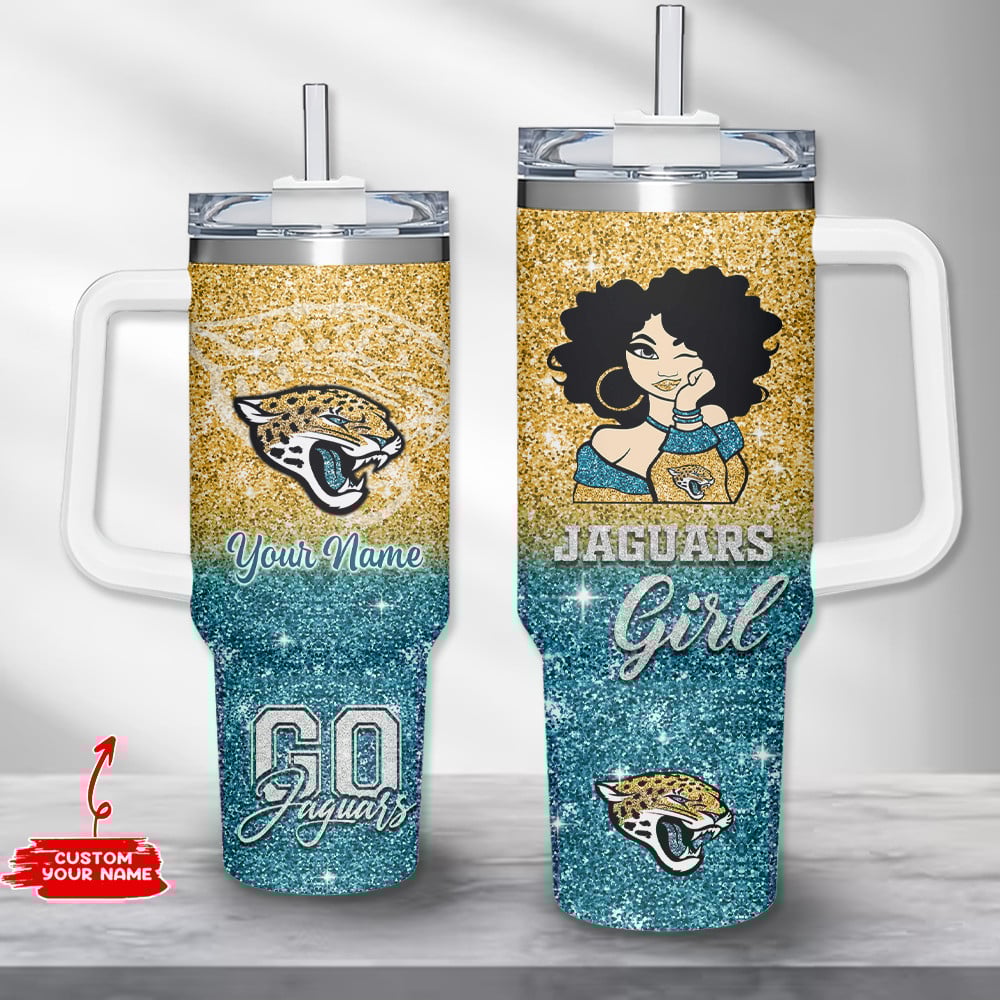 Show your team spirit with this custom Jaguars glitter tumbler. Personalize it with your name for a unique touch!