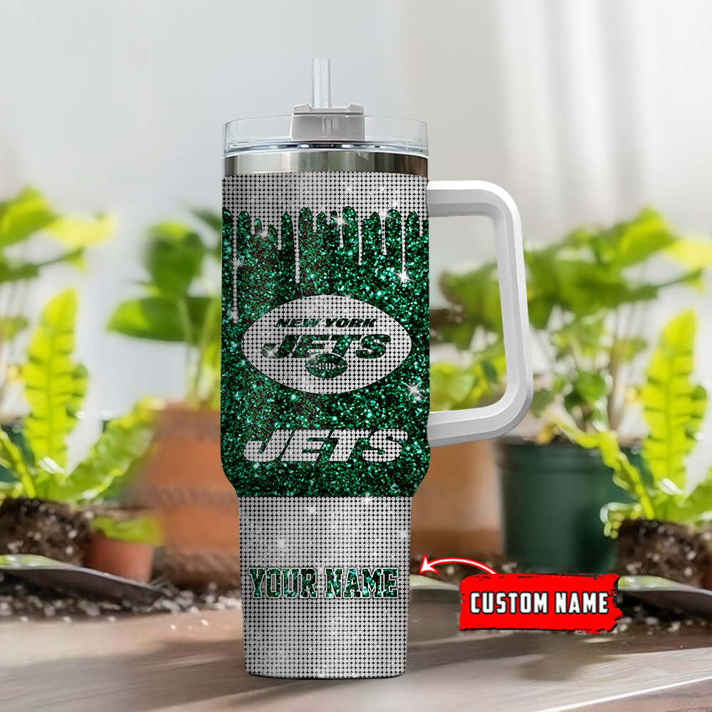 Custom Glitter Jets Tumbler with Handle – Personalized Sports Fan Gift