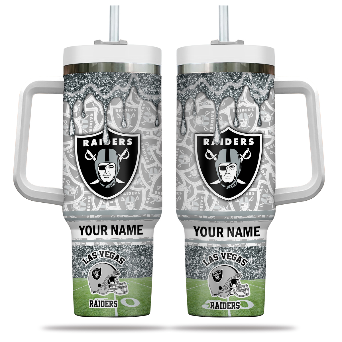 Show your team pride with this custom Las Vegas Raiders tumbler. Add your name for a personalized touch. Perfect for game days and everyday use.