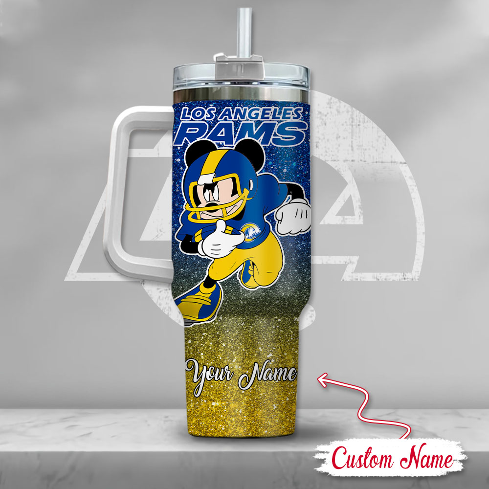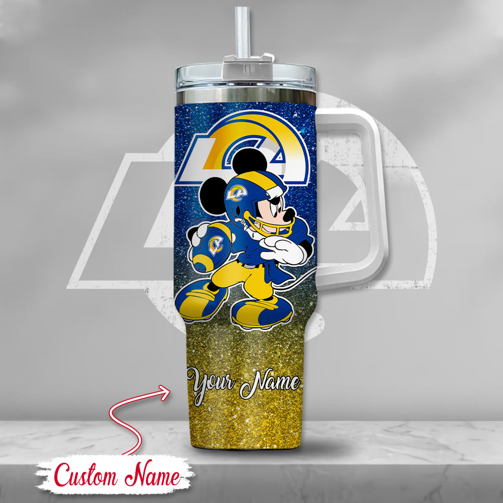 Stay hydrated and show your team spirit with this custom Los Angeles Rams tumbler featuring a playful Mickey design. Personalize it with your name for a unique touch!