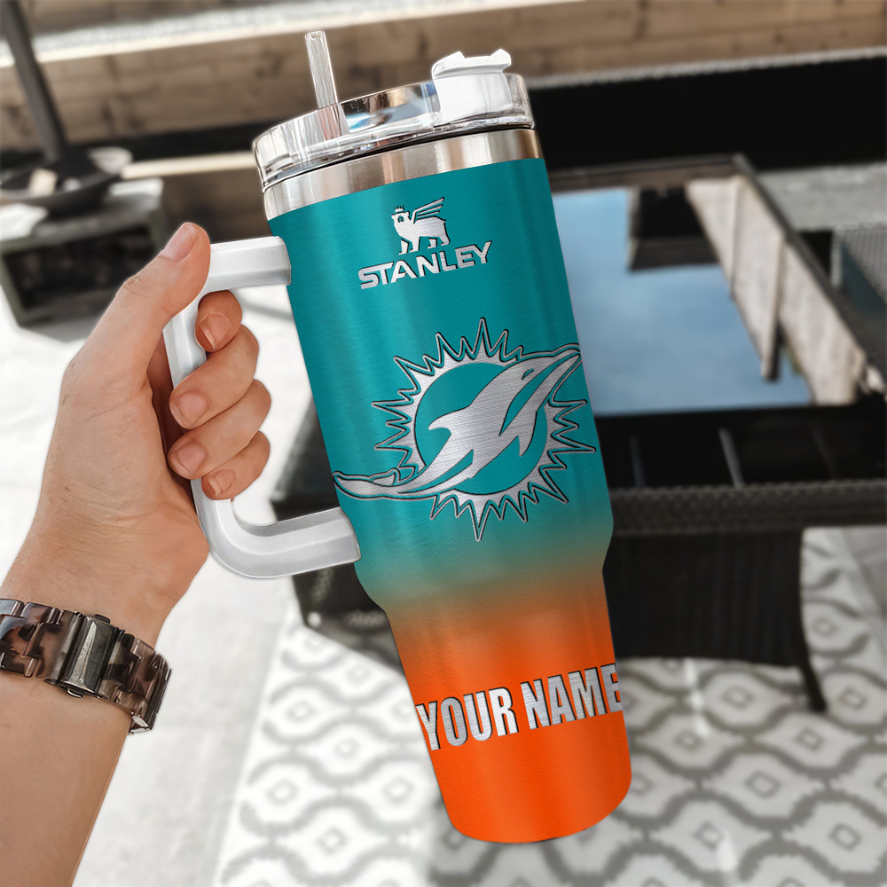 Stay refreshed and show team spirit with this custom Miami Dolphins tumbler. Personalize with your name for a unique touch. Perfect for fans!