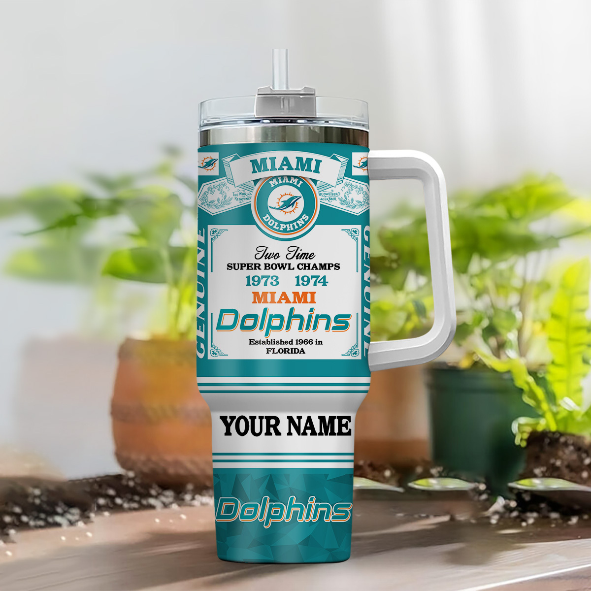 Show your team pride with this custom Miami Dolphins tumbler. Personalize it with your name and enjoy your drinks on-the-go in style.