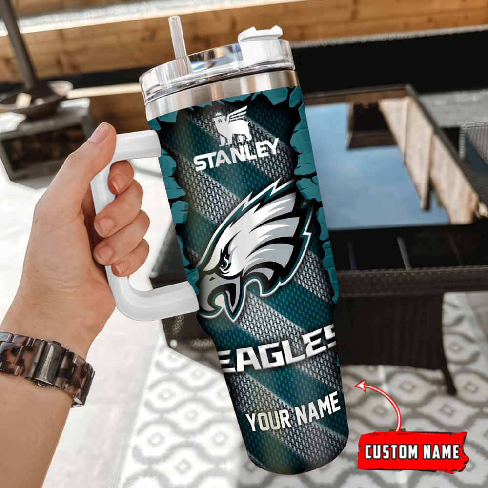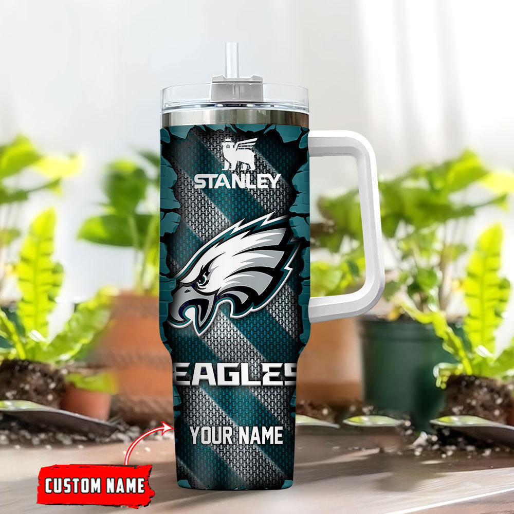 Stay refreshed in style with this custom Eagles tumbler. Personalize it with your name, featuring a sturdy handle and straw. Ideal for fans on the go!