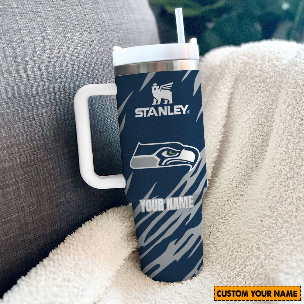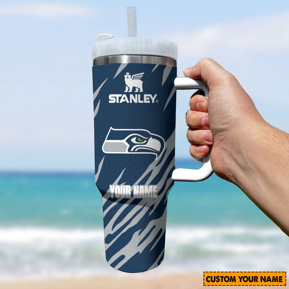 Stay hydrated in style with this personalized insulated travel mug. Features a bold blue tiger design and a convenient handle for easy carrying.