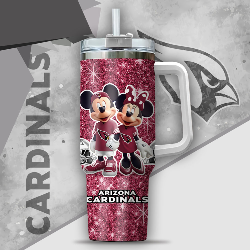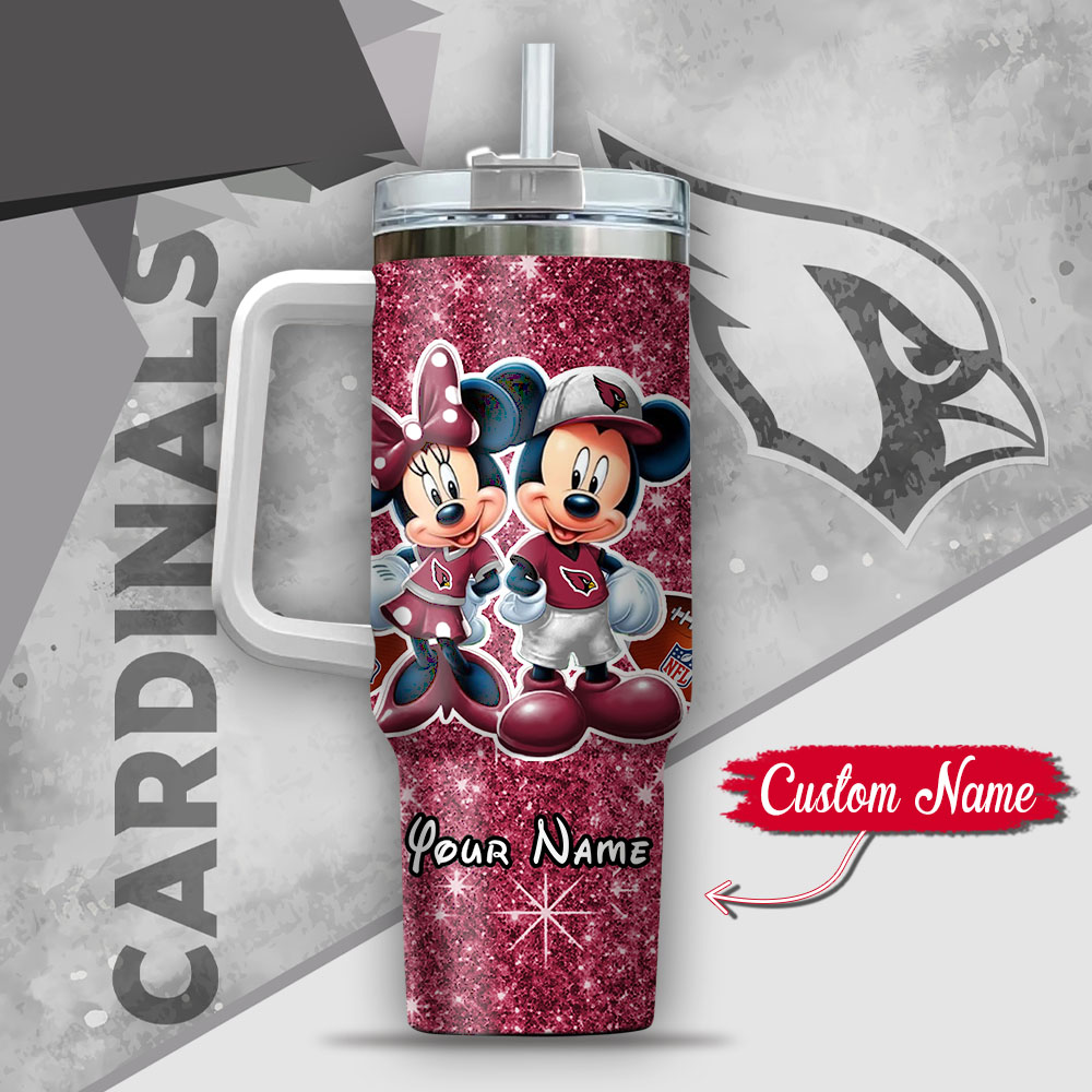 Show off your team spirit with this personalized Arizona Cardinals tumbler featuring Mickey and Minnie. Perfect for keeping drinks hot or cold on the go!