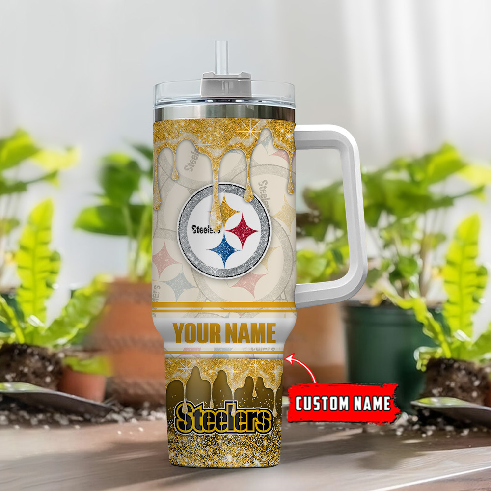 Show your Steelers pride with a custom name tumbler! This glittery travel mug keeps drinks hot or cold, perfect for any fan on the go.