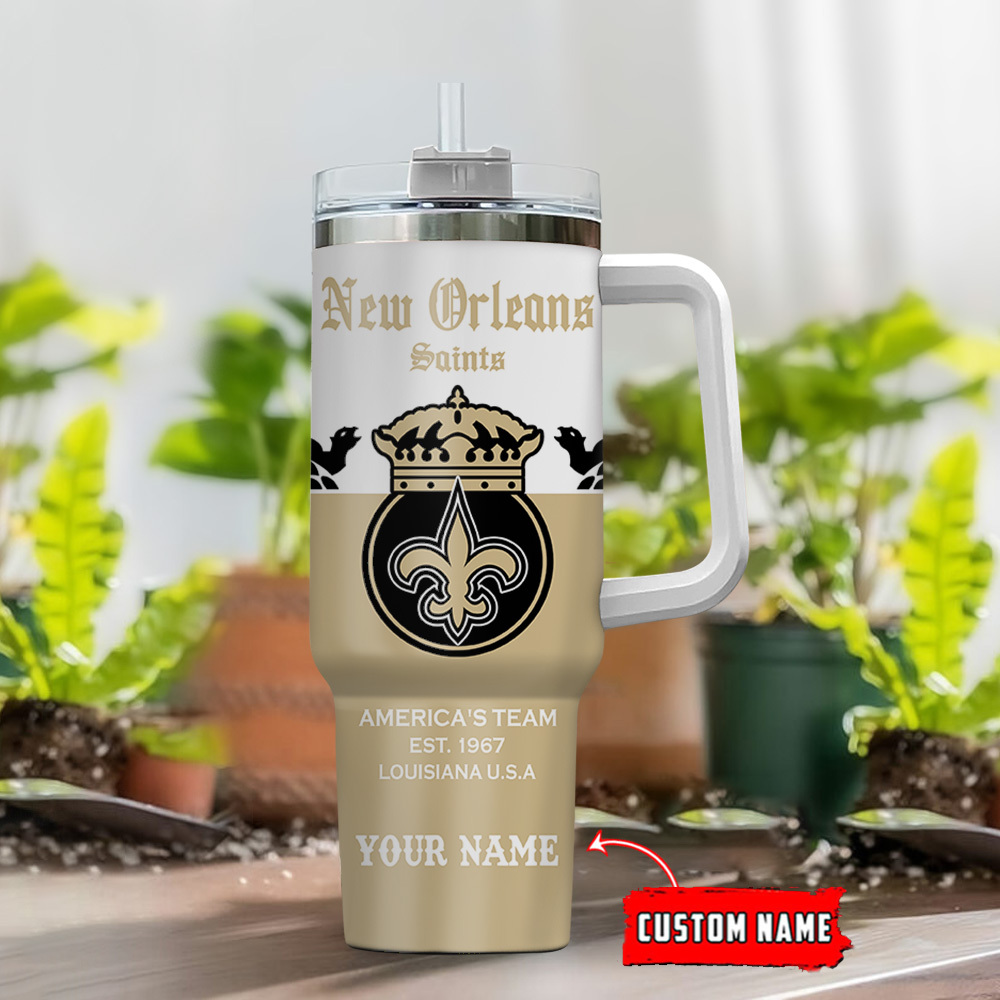 Show off your team spirit with this personalized New Orleans Saints tumbler. Perfect for game days, it keeps your drink hot or cold.