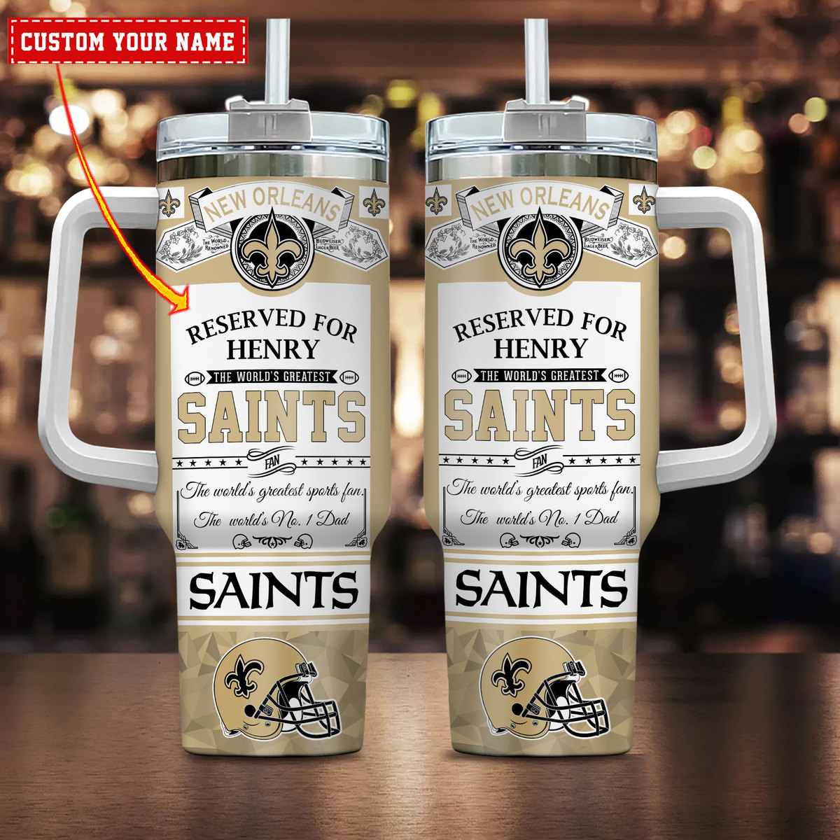 Show off your team pride with this custom New Orleans Saints tumbler. Personalize it with a name for the ultimate fan gift. Perfect for game day!