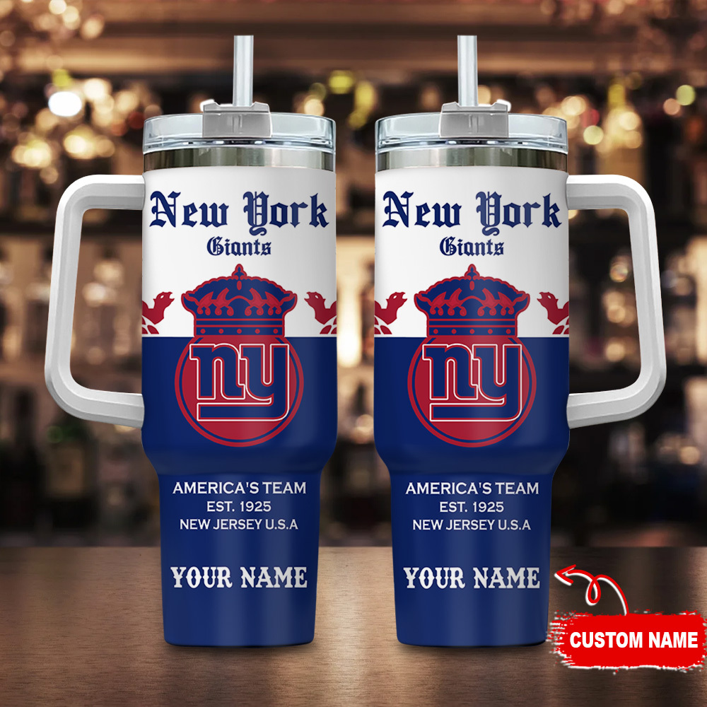 Show your team spirit with this personalized New York Giants tumbler. Perfect for fans, it comes with a handle and straw for easy sipping.