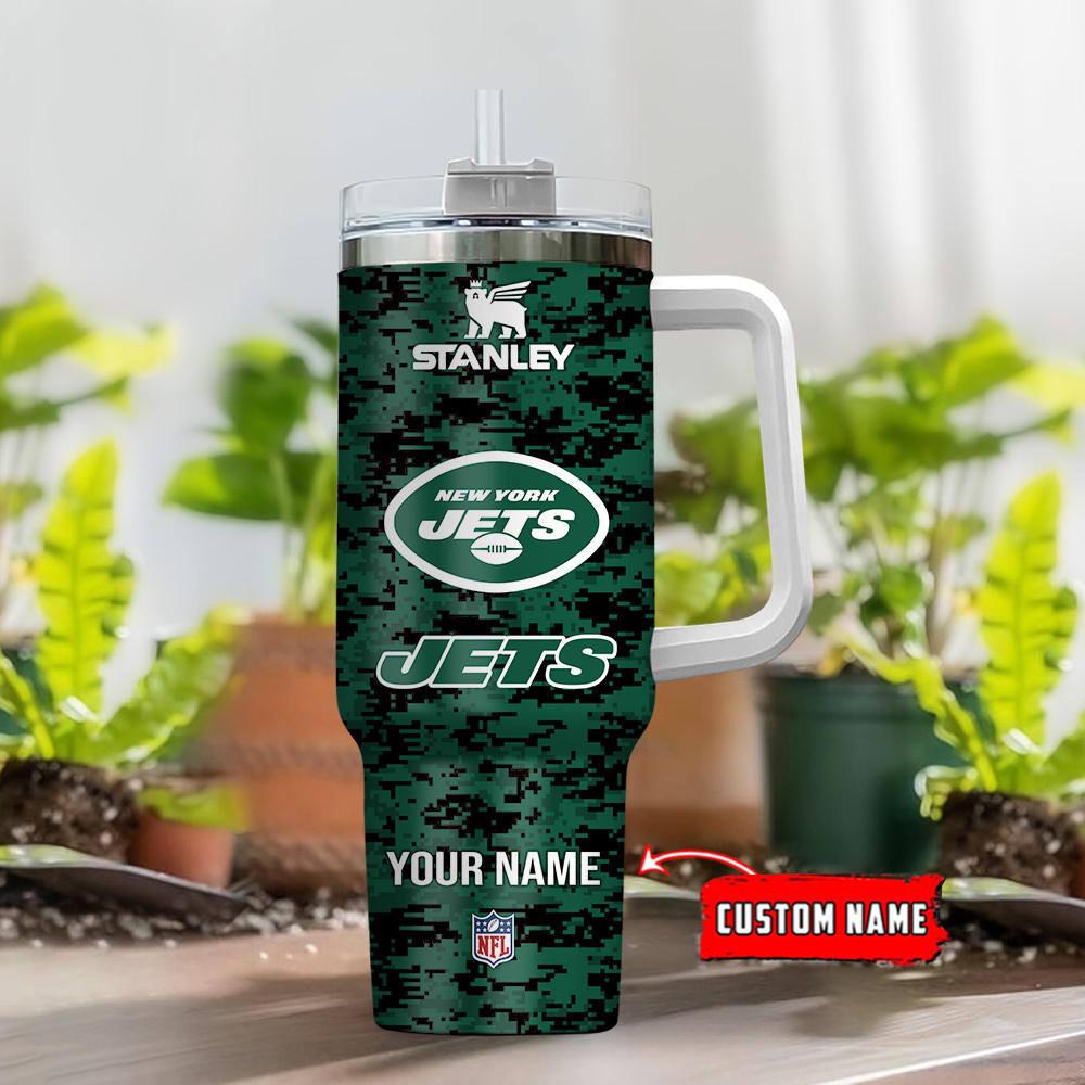Show your team spirit with this custom New York Jets tumbler. Features a durable design, handle, and straw for easy sipping. Personalize with your name!