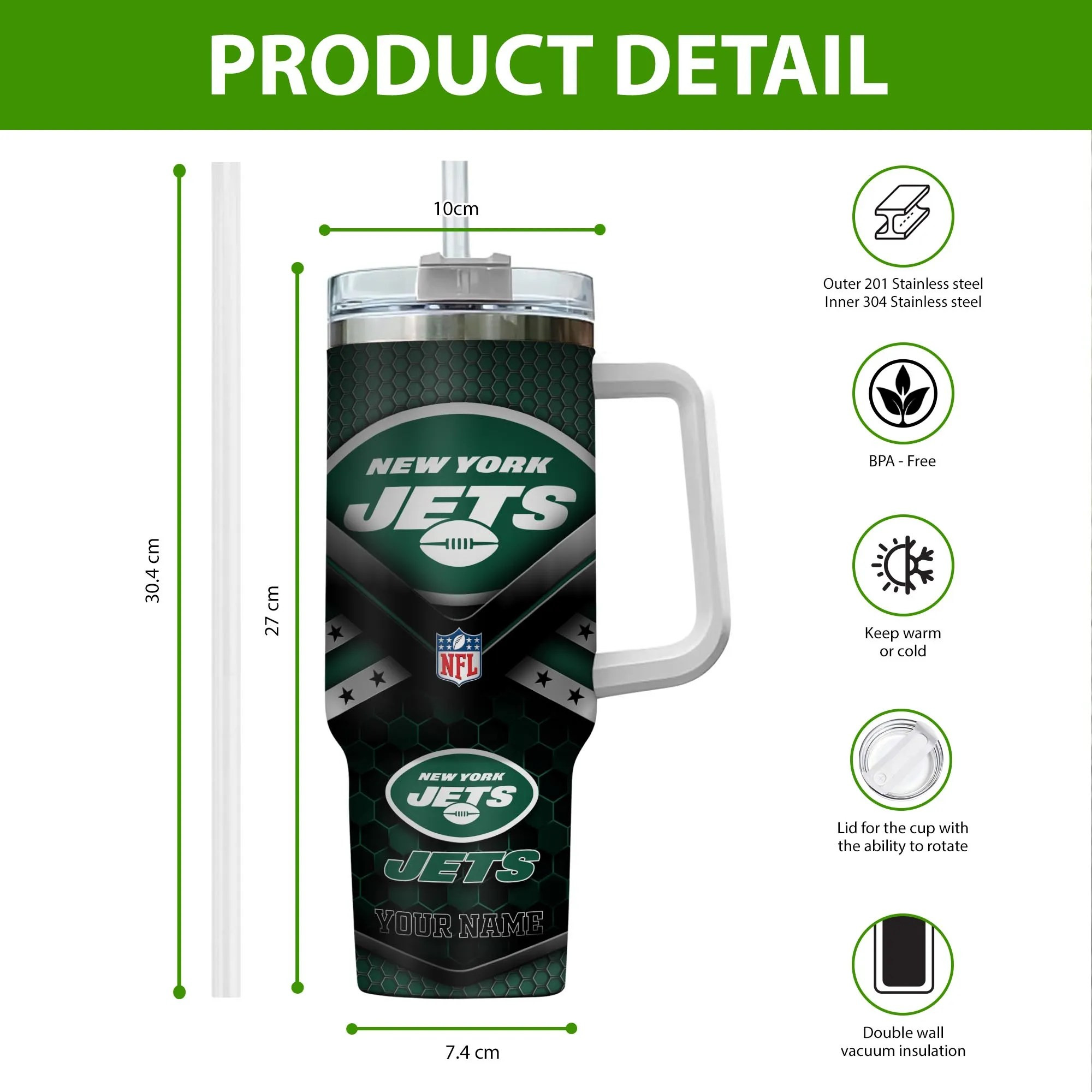 Show your team spirit with this customizable New York Jets tumbler. Add your name for a personal touch. Great for on-the-go hydration!