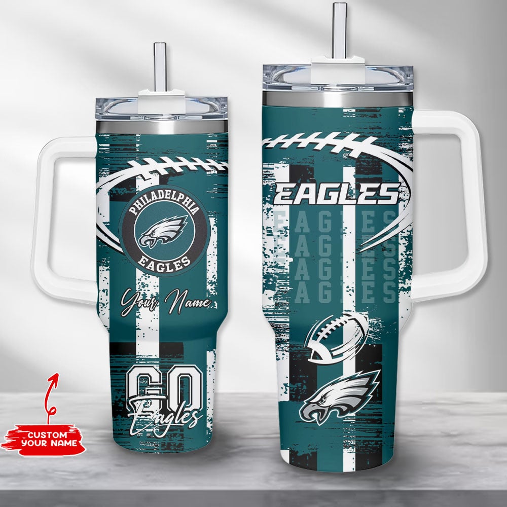 Show your team spirit with this custom Philadelphia Eagles tumbler. Perfect for fans, it features a handle and can be personalized with your name.