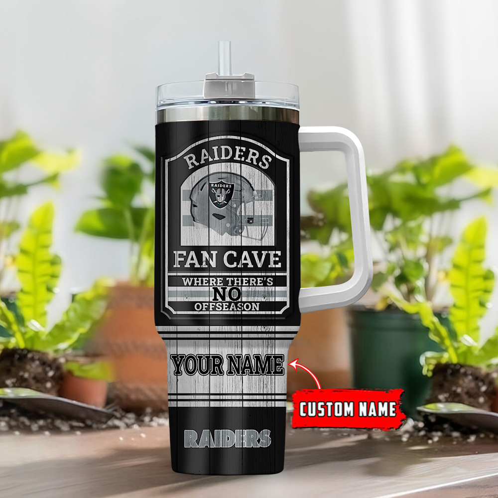 Show your team spirit with this custom Raiders Fan Cave tumbler mug. Personalize it with your name for the ultimate fan experience.