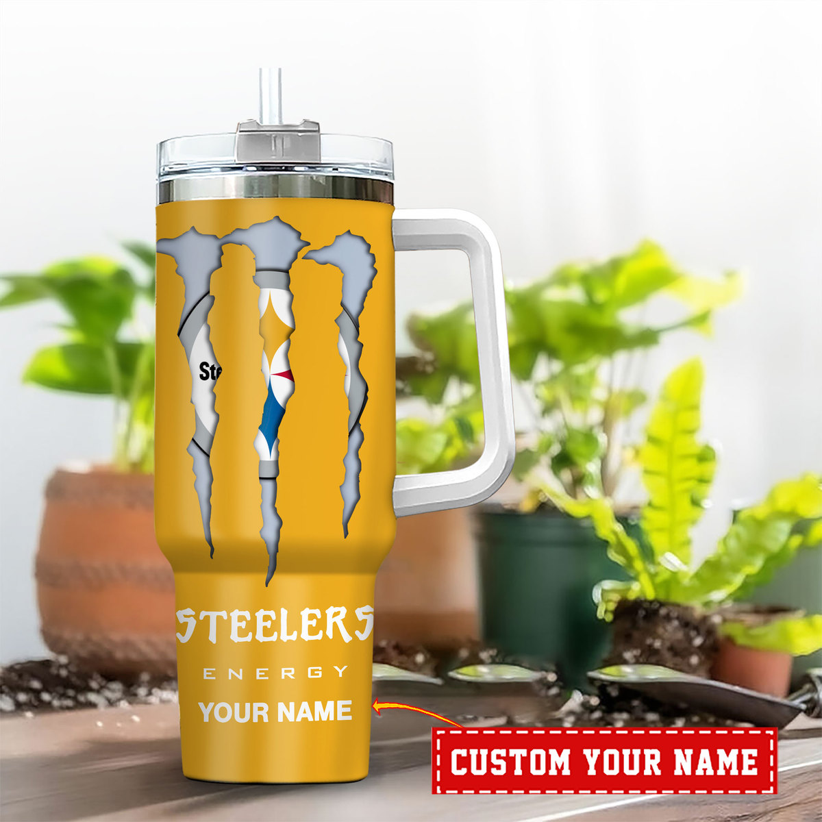 Show off your team spirit with this personalized Steelers energy drink tumbler. Perfect for game days, this tumbler features a sturdy handle and straw for easy sipping.