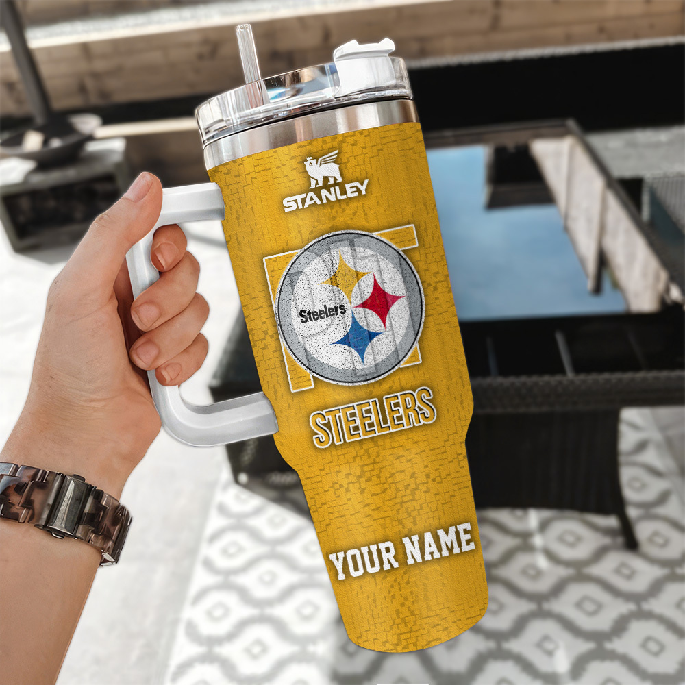 Show your team spirit with this custom Steelers tumbler! Personalize it with your name. Perfect for hot or cold drinks on the go.