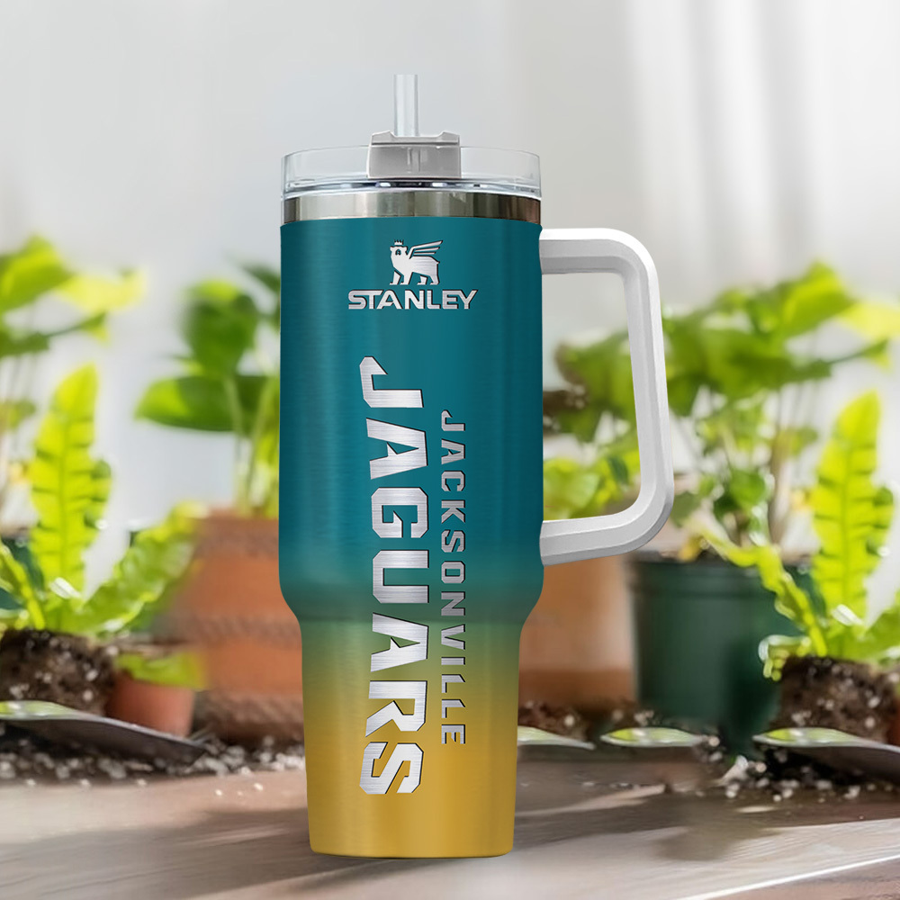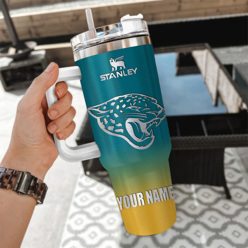 Support your team in style with the customizable Jacksonville Jaguars tumbler. Features a straw and handle for convenient sipping on the go. Perfect for any NFL fan.