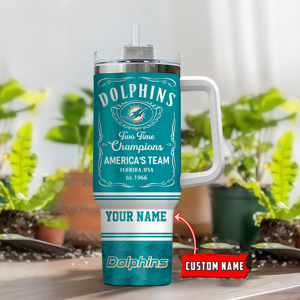 Celebrate your team spirit with this personalized Miami Dolphins tumbler. Perfect for on-the-go hydration with a secure handle and straw.