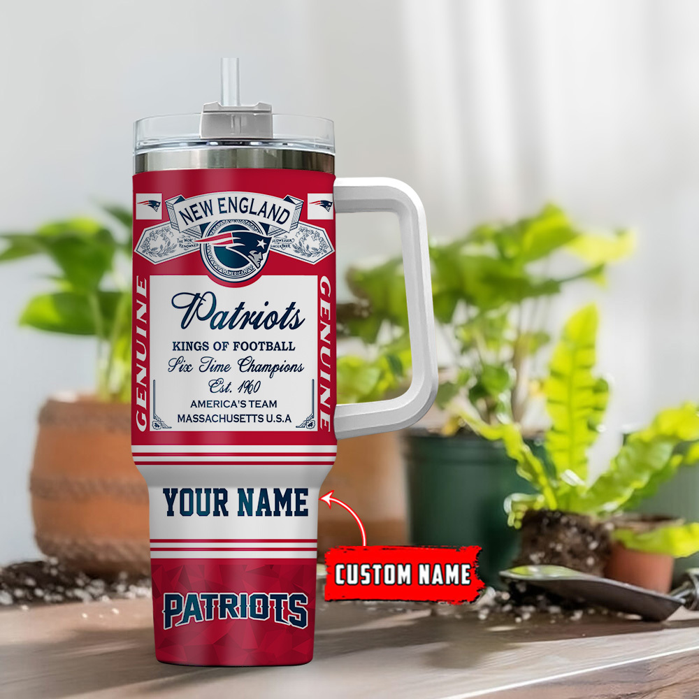Show your team pride with this customizable New England football travel mug. Perfect for game days or everyday use. Personalize it with your name!