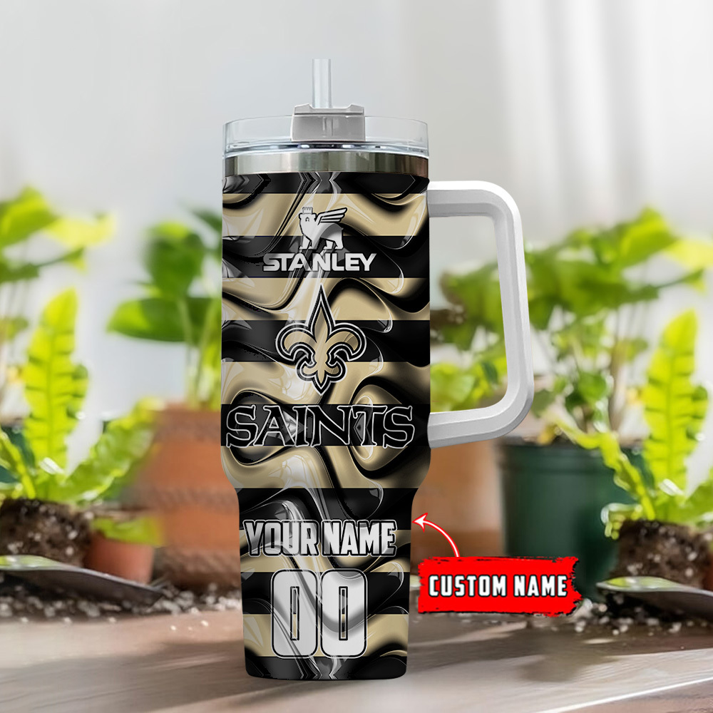 Show off your team spirit with this customizable Saints tumbler. Durable stainless steel with a handle, perfect for hot or cold drinks. Add your name for a personalized touch!