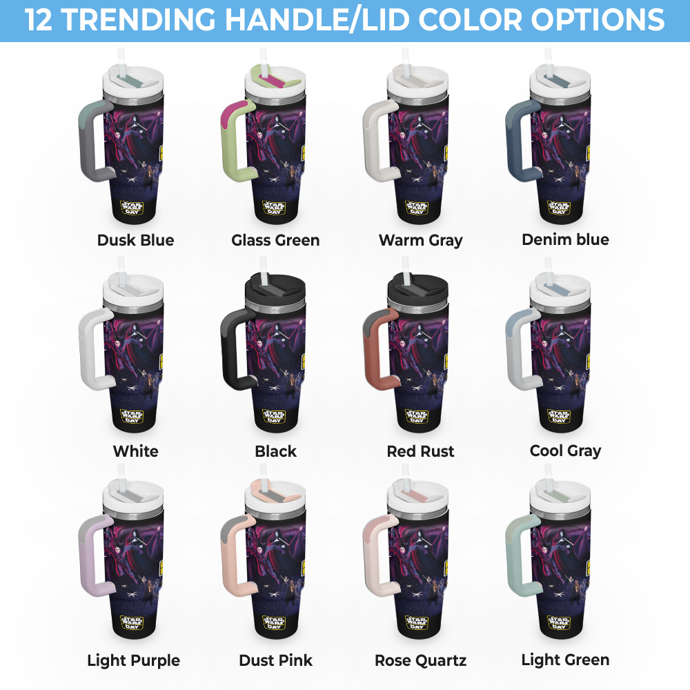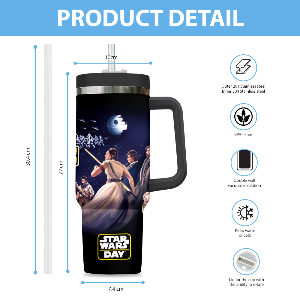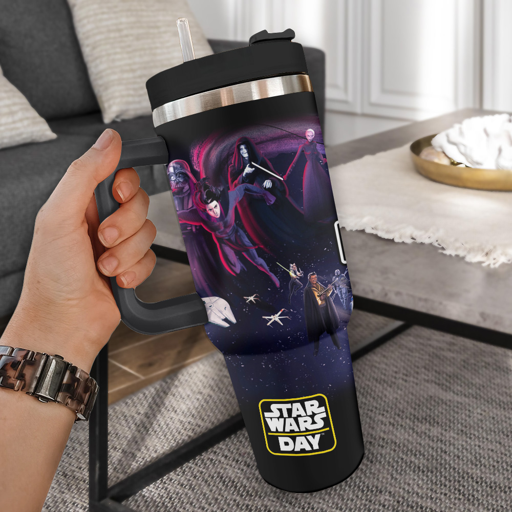Celebrate Star Wars Day with a personalized tumbler featuring iconic characters. Perfect for fans and keeps drinks hot or cold.