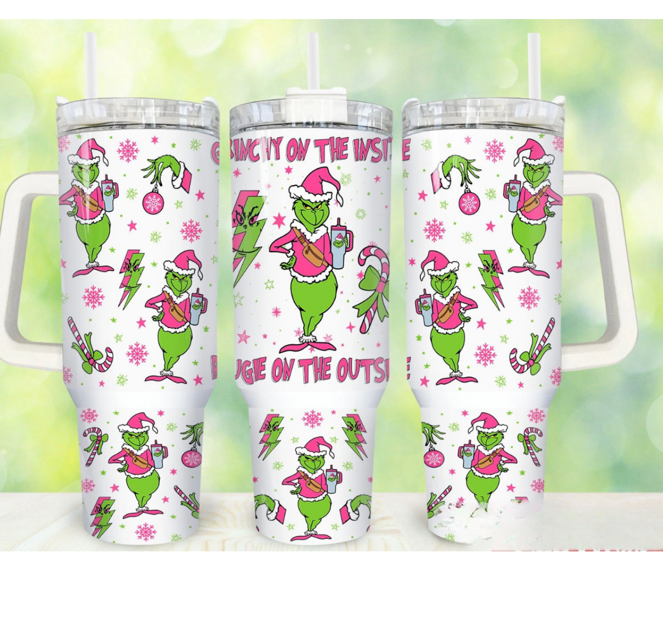 Celebrate the season with this fun Grinch-themed tumbler. Perfect for hot or cold drinks, it features a festive design with a secure lid and straw.