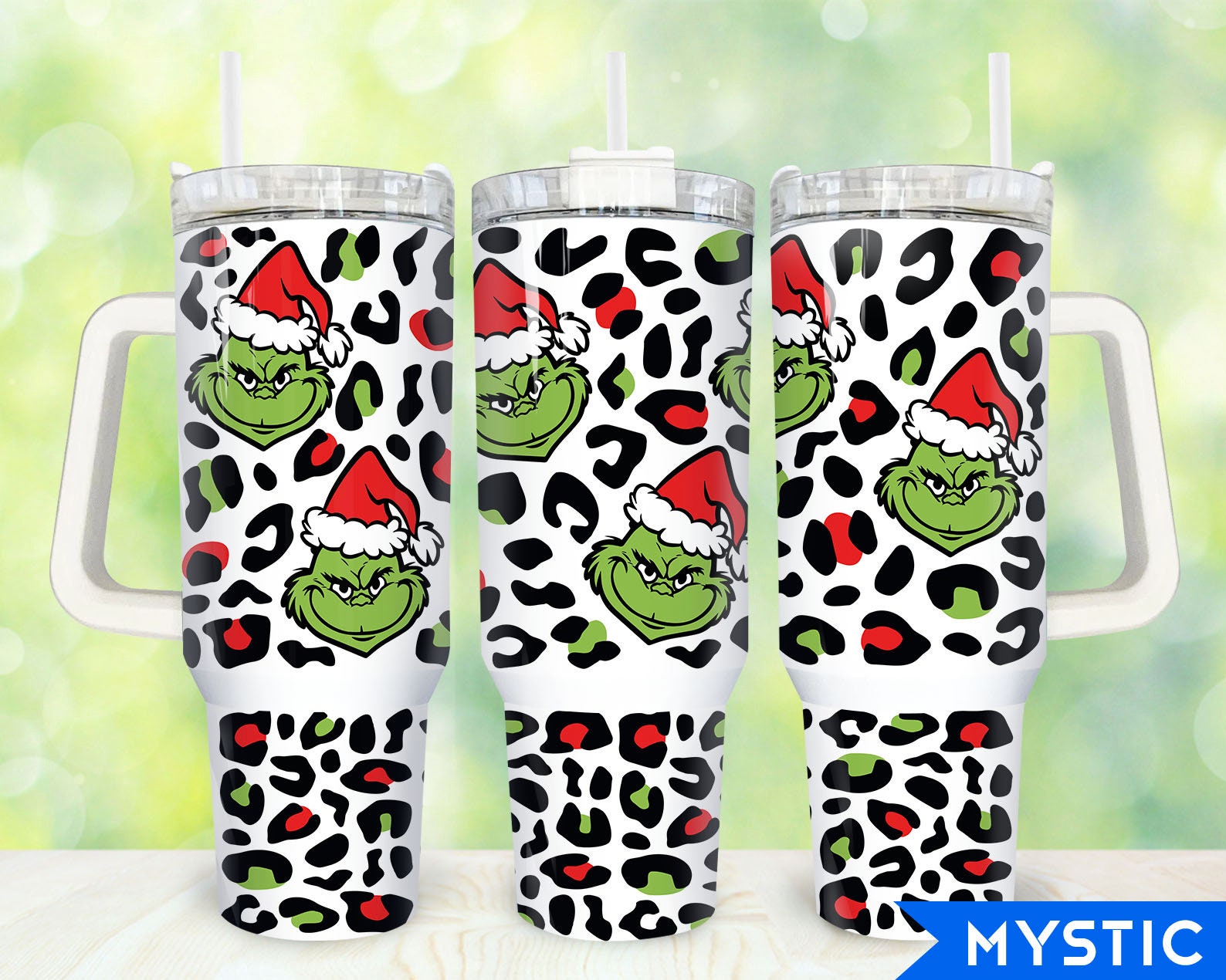 Celebrate the holidays in style with this Grinch-themed insulated tumbler. Perfect for keeping drinks hot or cold, featuring a fun leopard print design.