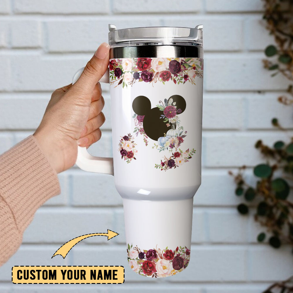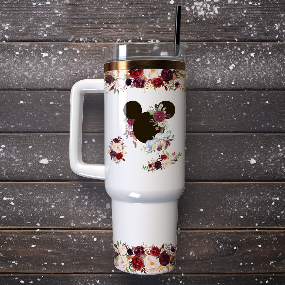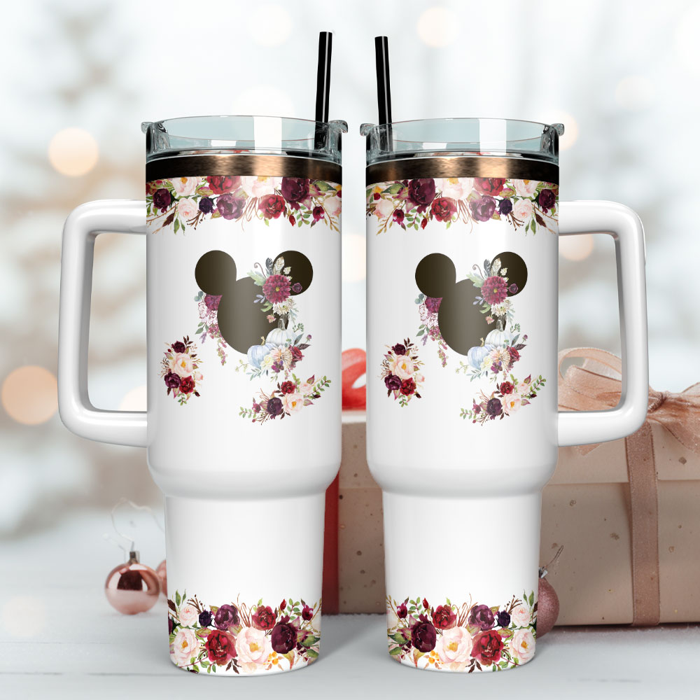 Stay refreshed with this charming floral Mickey Mouse tumbler. Features a double-wall design, convenient handle, and straw for easy sipping.
