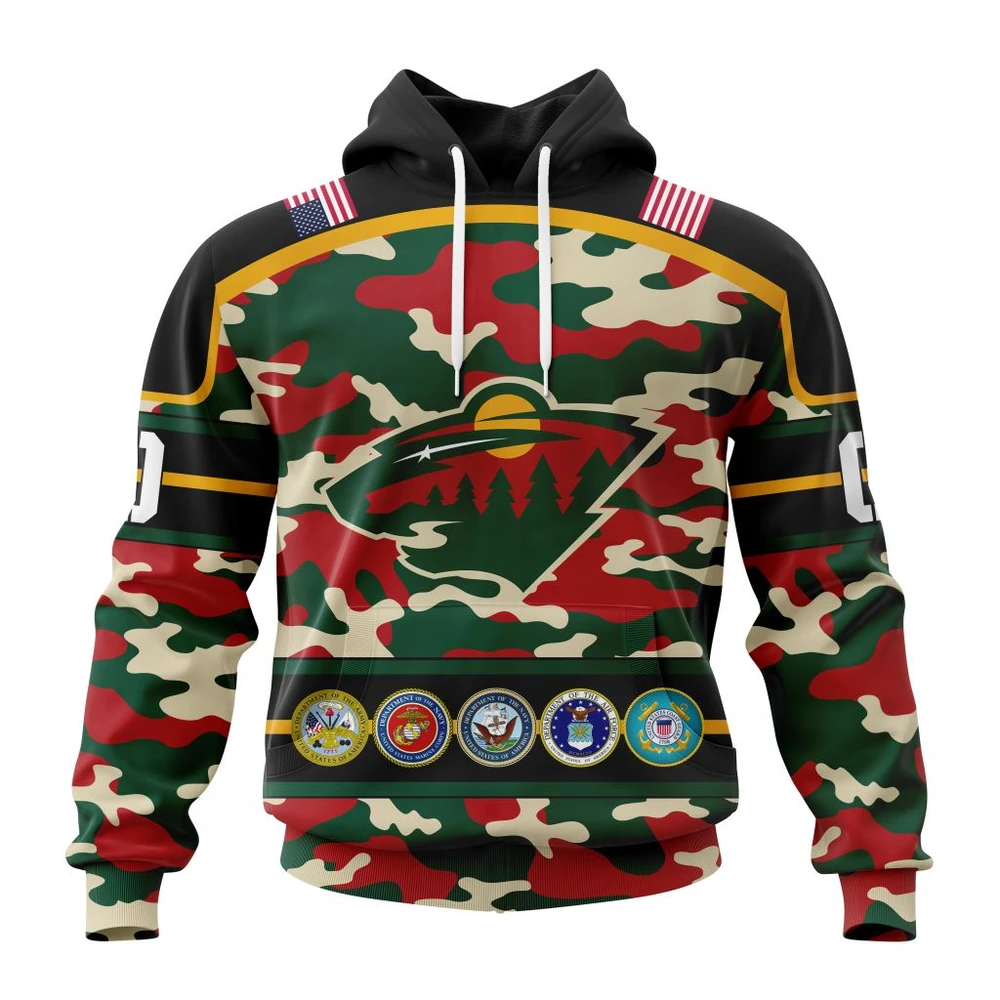 Hoodie NHL Minnesota Wild, Specialized Design Wih Camo Team Color And Military Force Logo QTNHL080524A3535HD