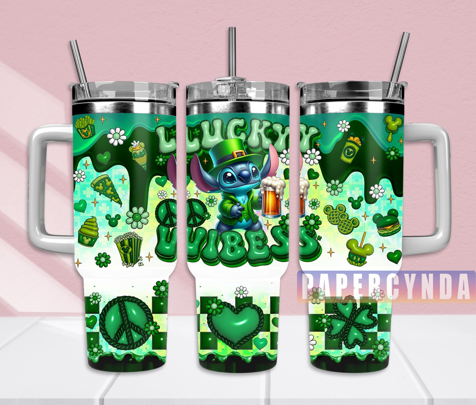 Celebrate St. Patrick’s Day with this vibrant ‘Lucky Vibes’ tumbler! Featuring an adorable character design, it’s perfect for festive drinks.