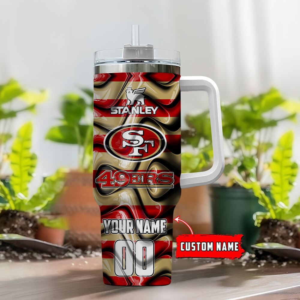 Show your 49ers pride with this customizable Stanley tumbler. Features a sturdy handle and personal touch with your name and number.