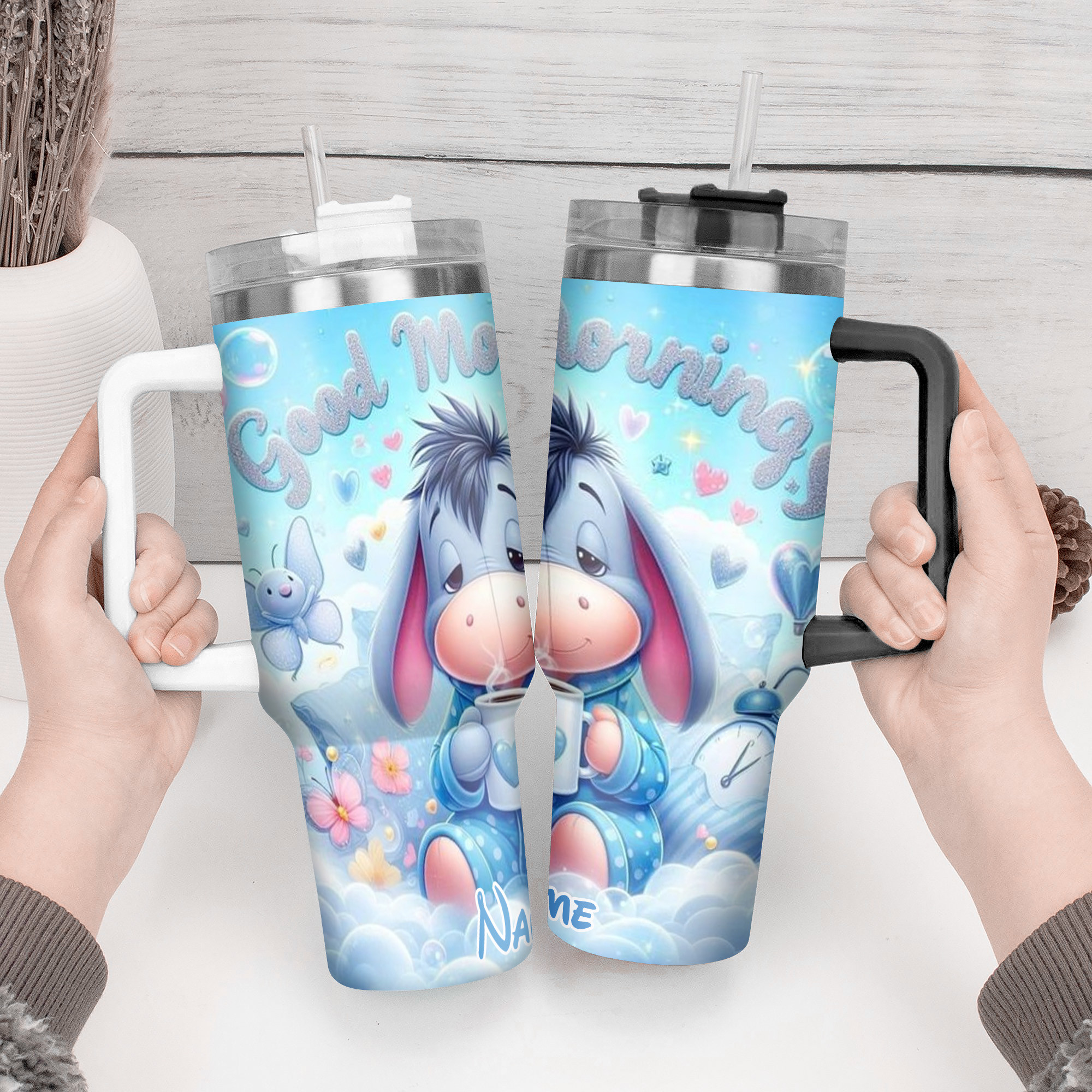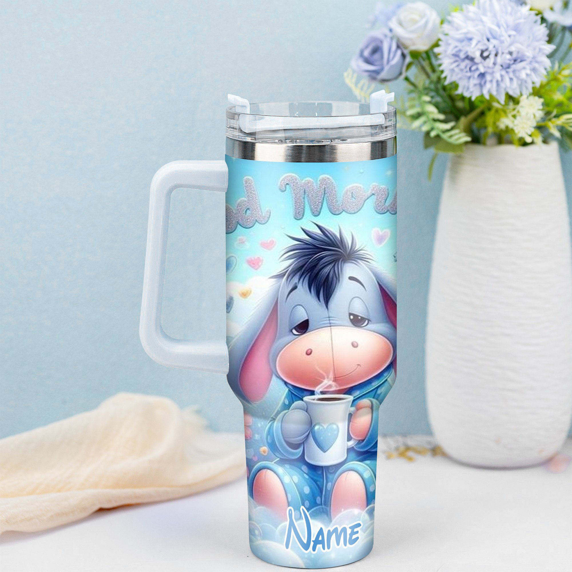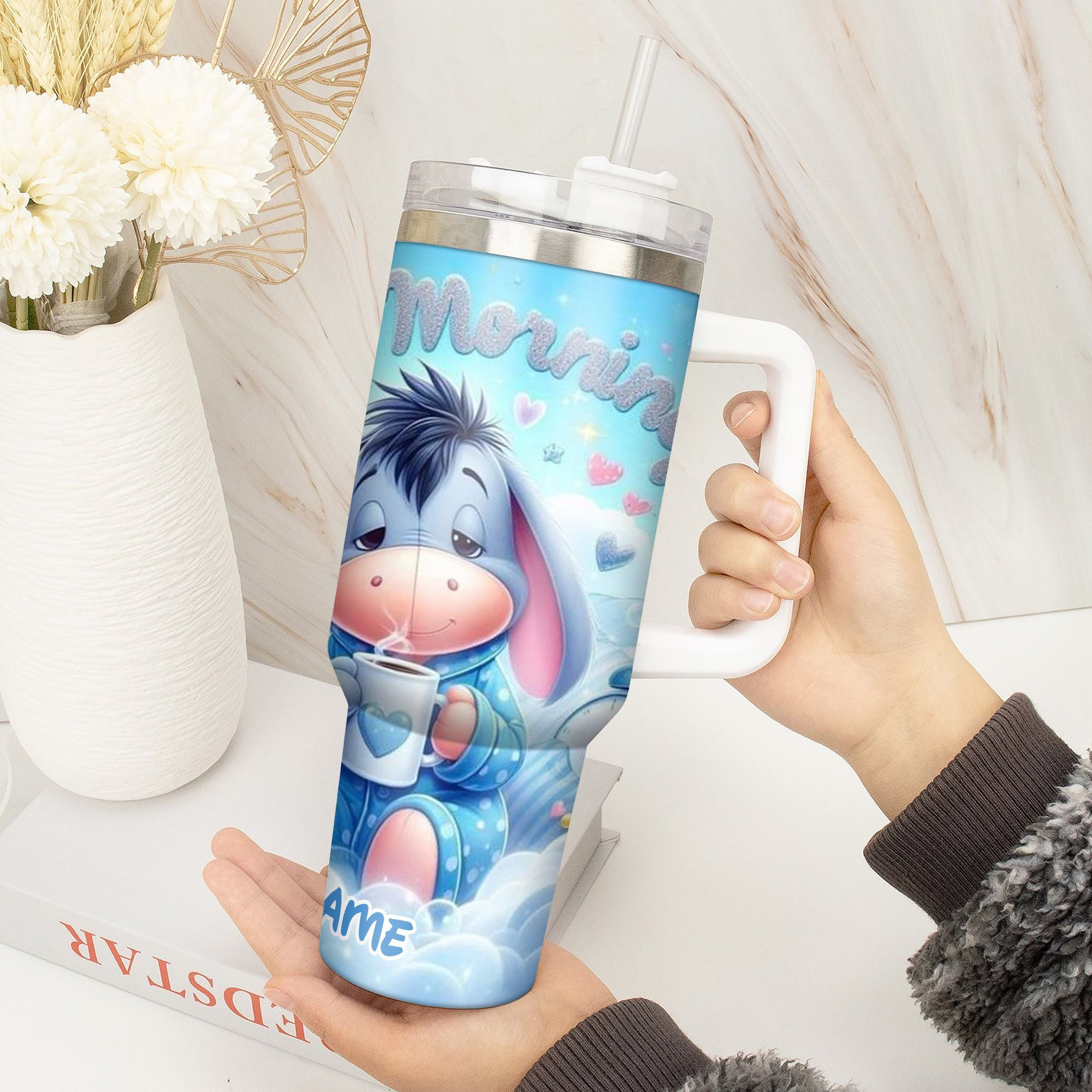 Start your day with a smile using this charming tumbler featuring a cute cartoon design. Personalize it with your name for a special touch.