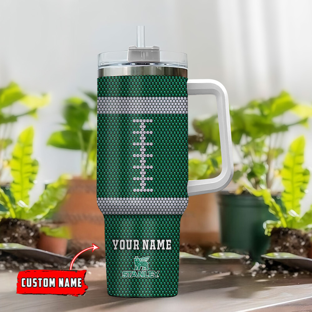 Show your support with this custom name football tumbler. Perfect for keeping drinks hot or cold while cheering on your team!