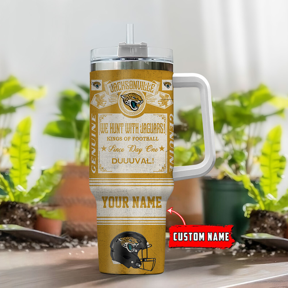 Show off your team pride with this personalized Jacksonville Jaguars tumbler. Perfect for any fan, customize it with your name for a unique touch.