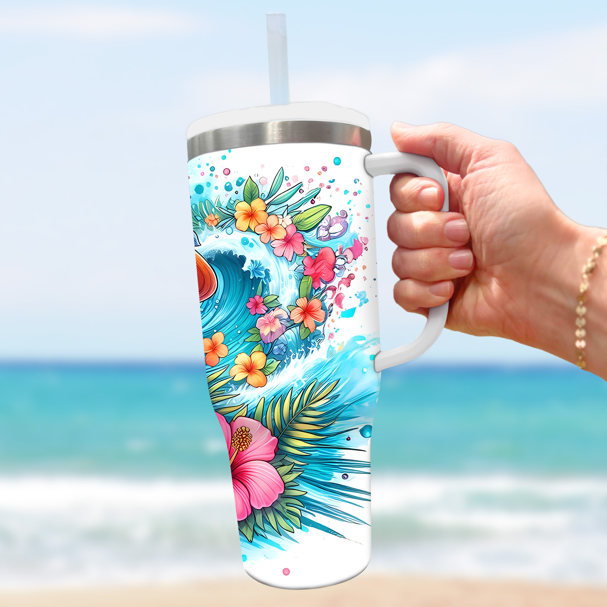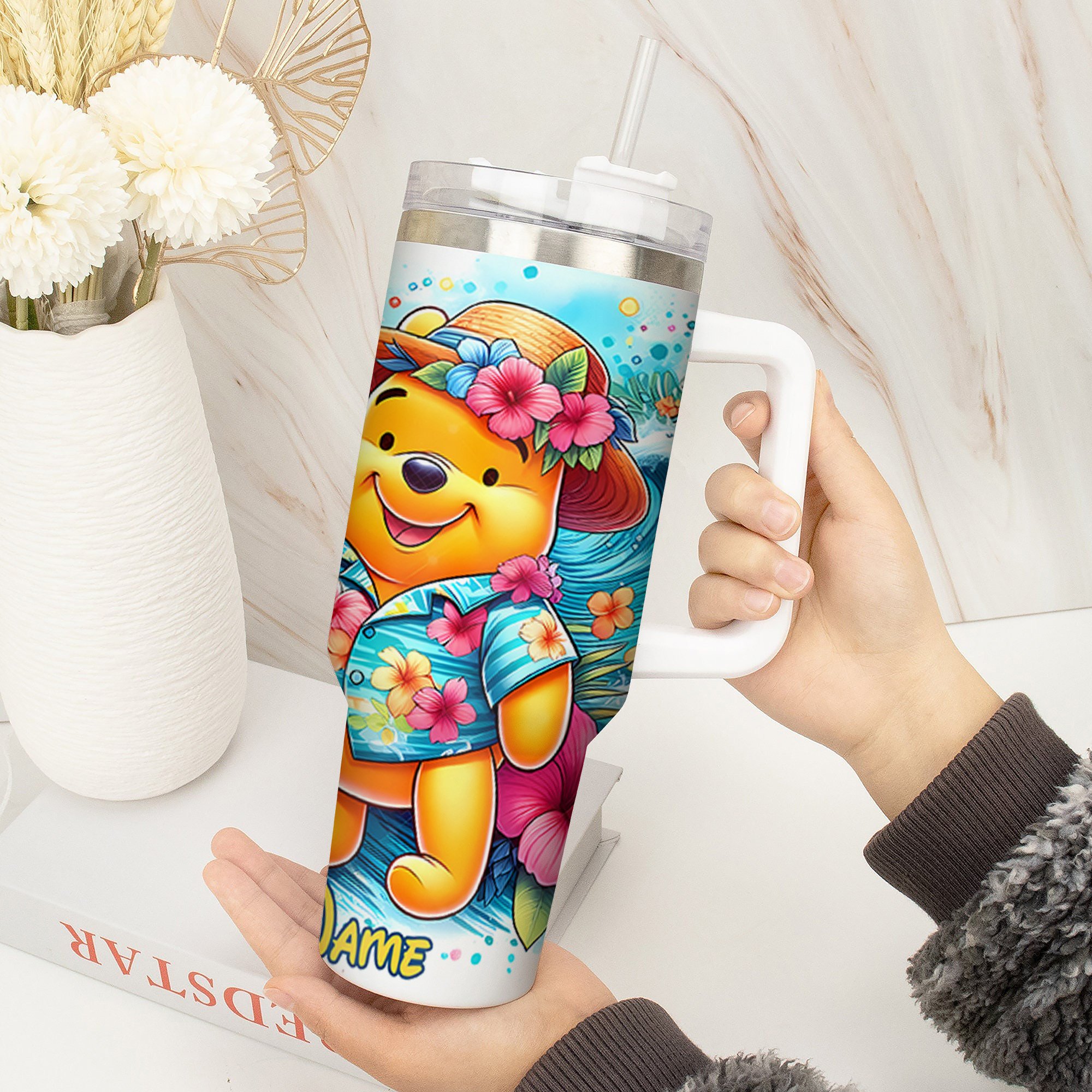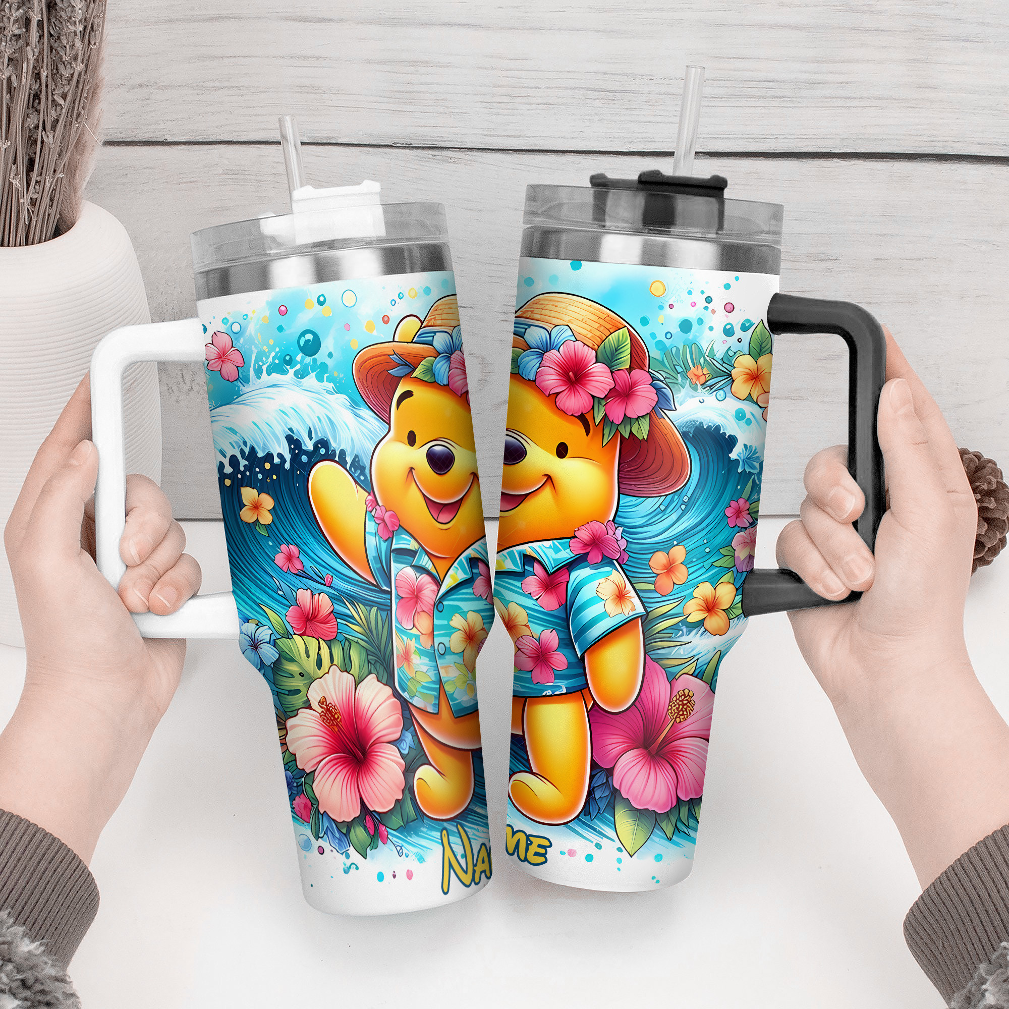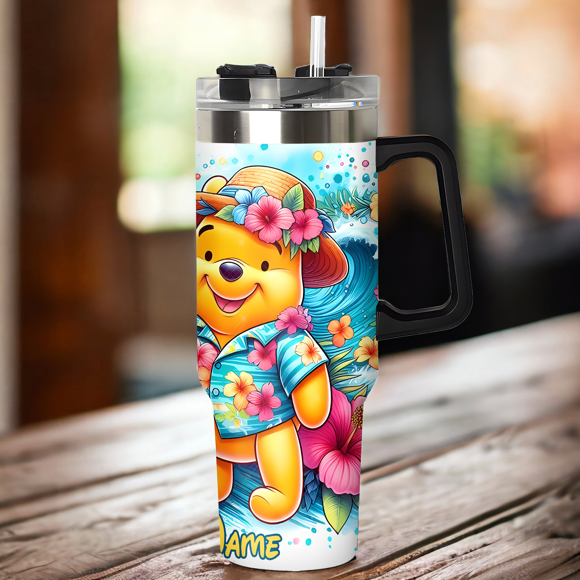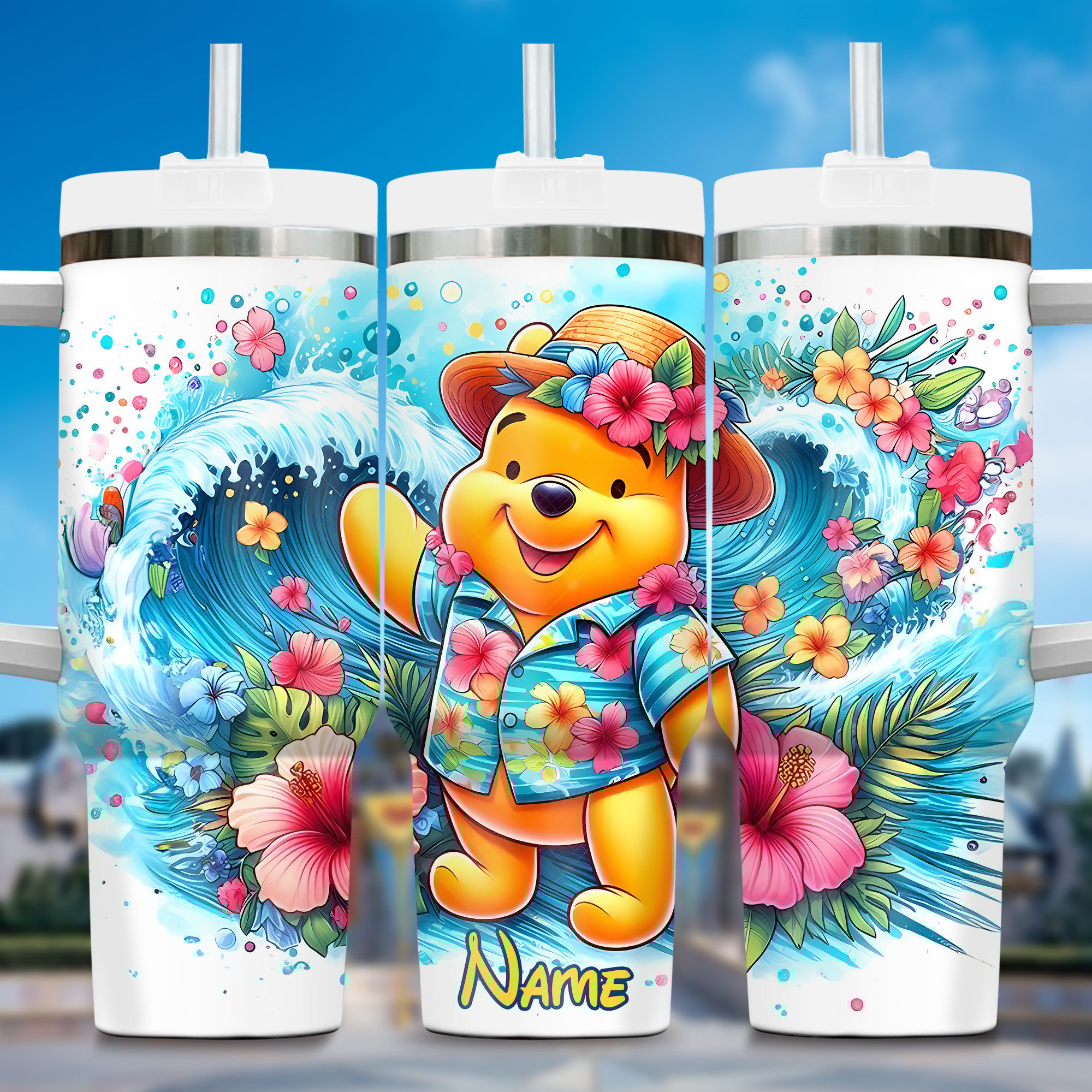 Stay refreshed with this vibrant tropical-themed tumbler featuring a charming bear design. Personalize it with your name for a unique touch.
