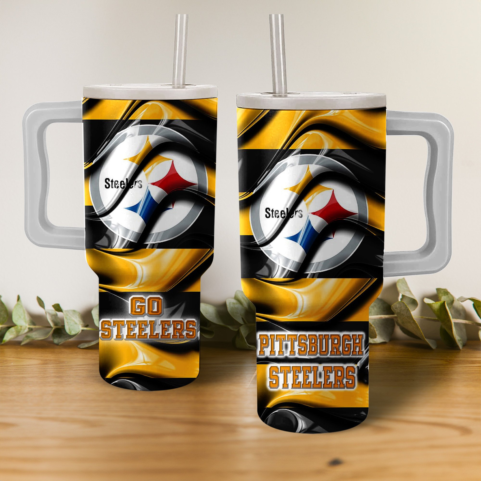 Show your team spirit with this vibrant Pittsburgh Steelers tumbler mug. Keep your drinks hot or cold while cheering for your favorite team!