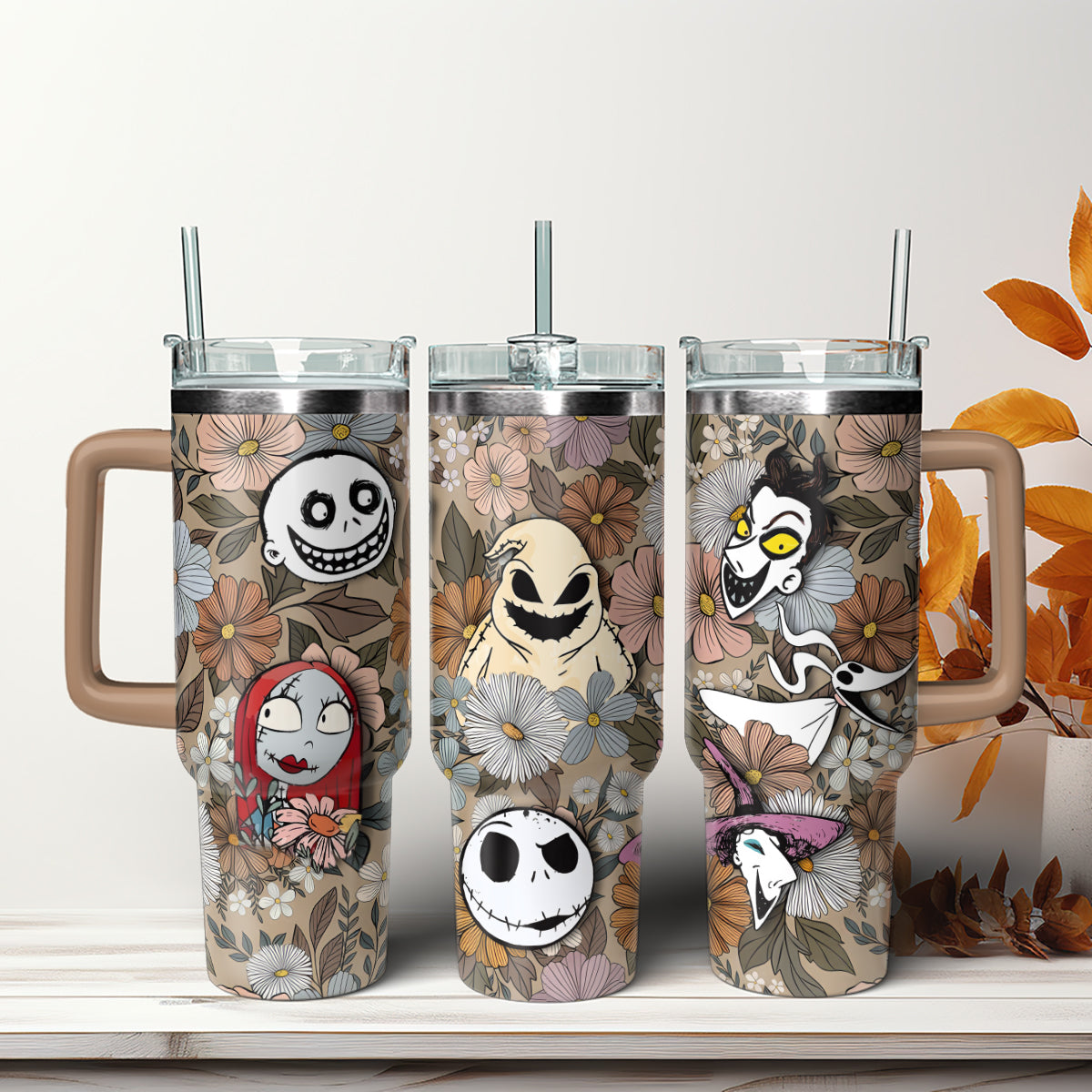 Stay hydrated in style with this spooky floral tumbler! Featuring iconic Halloween characters, this insulated cup is perfect for keeping drinks hot or cold.