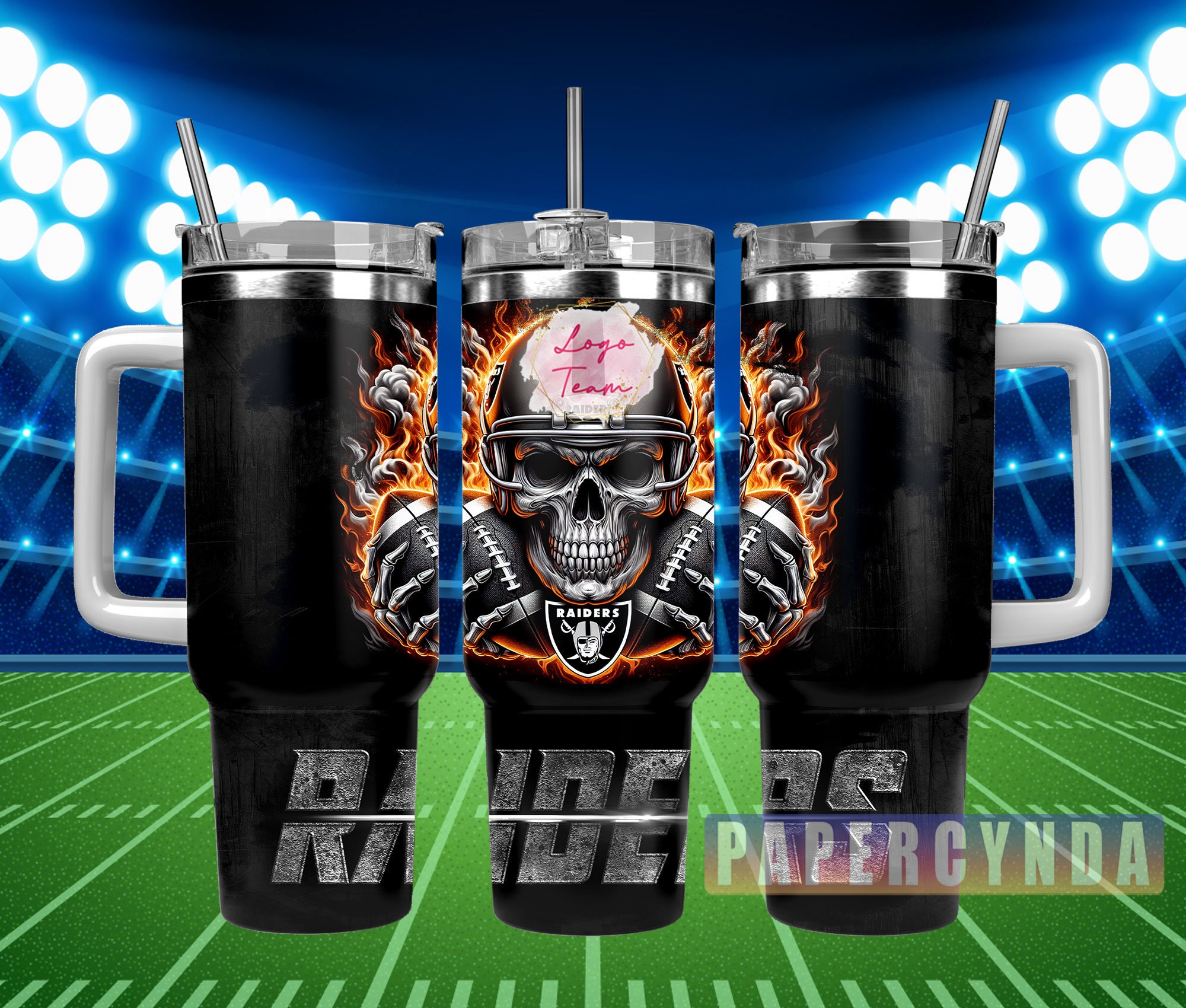 Show your team spirit with this striking Raiders tumbler! Featuring a bold skull design, handle, and straw, it’s perfect for game day and beyond.
