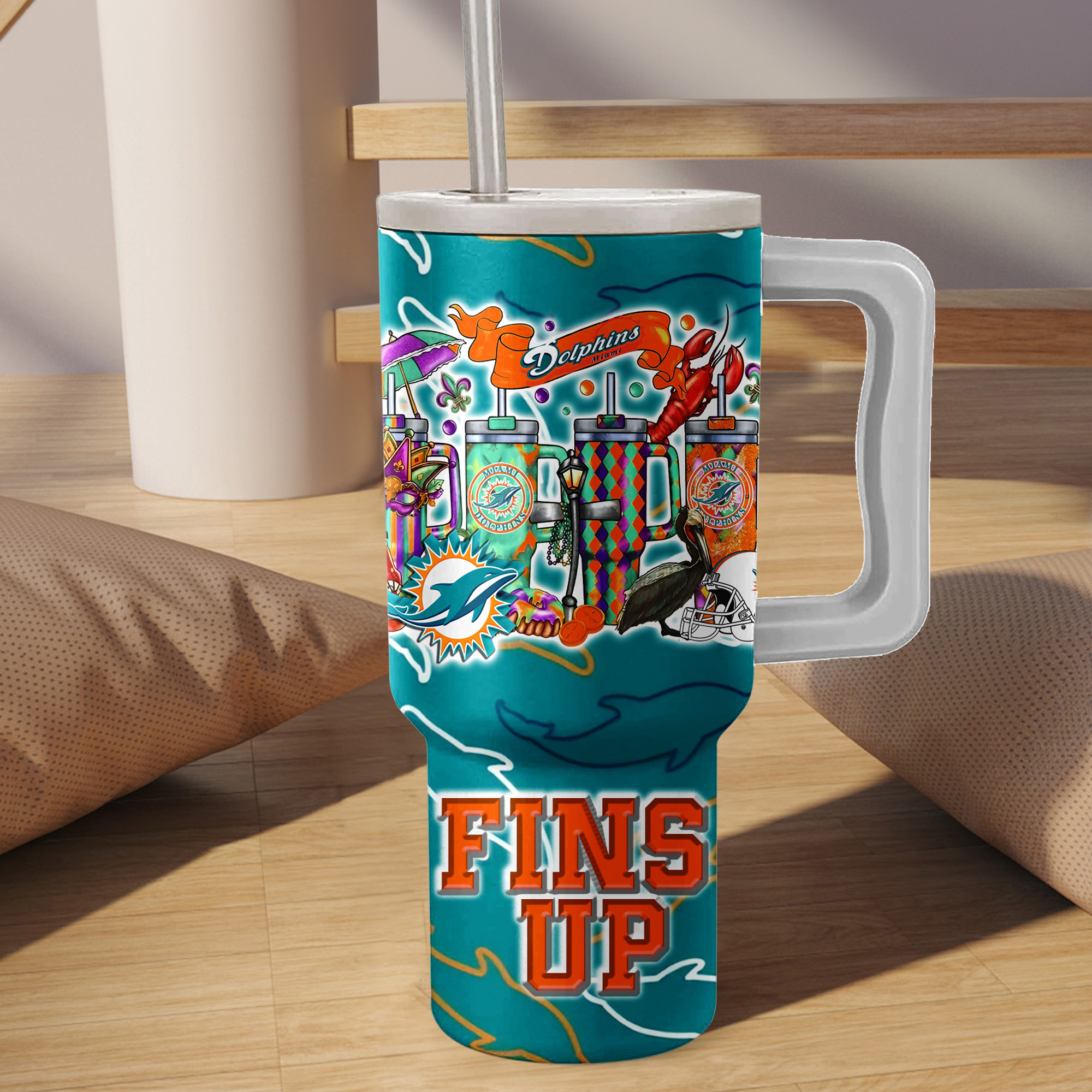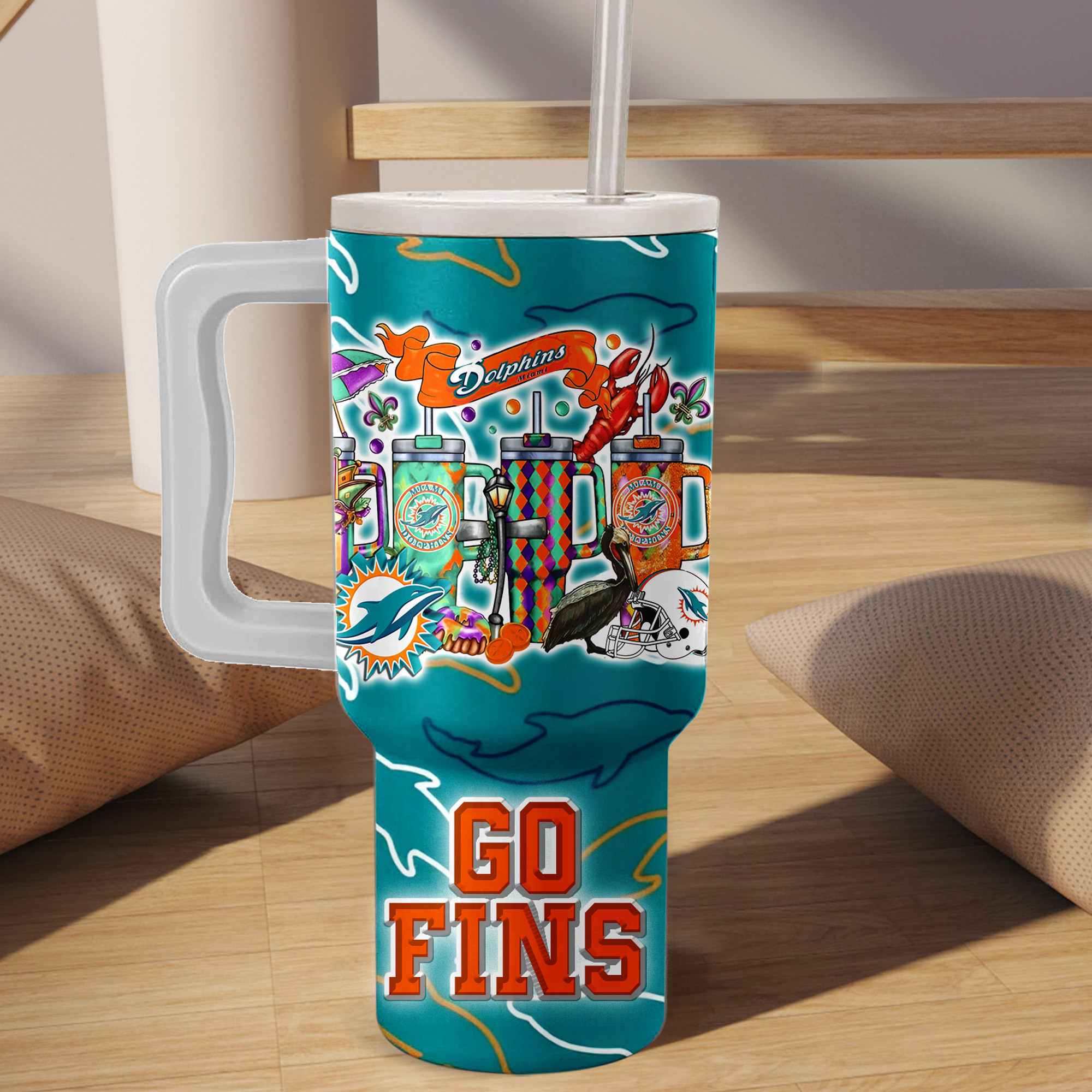 Show your team spirit with this colorful Dolphins tumbler. Perfect for keeping your drinks hot or cold while cheering on your favorite team.