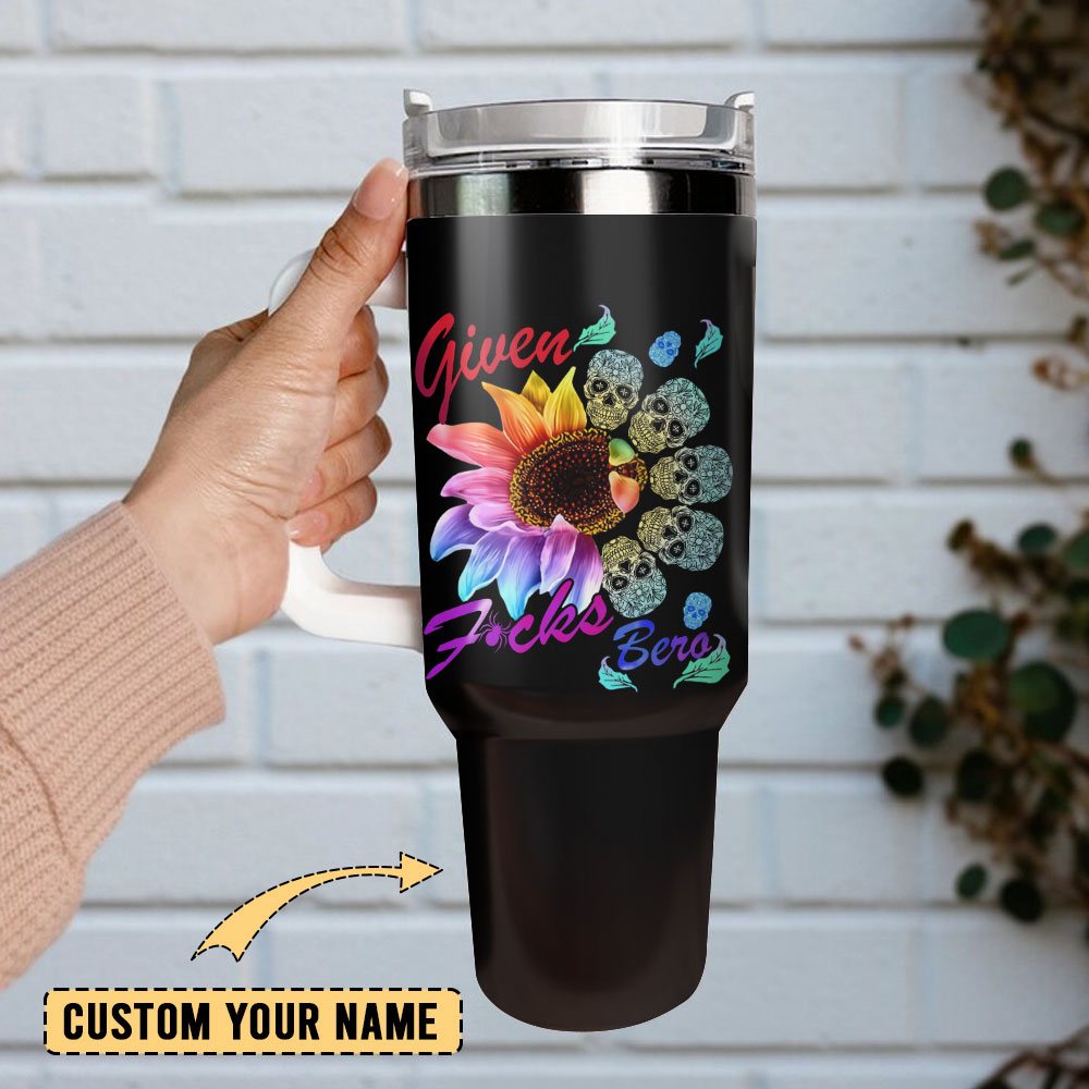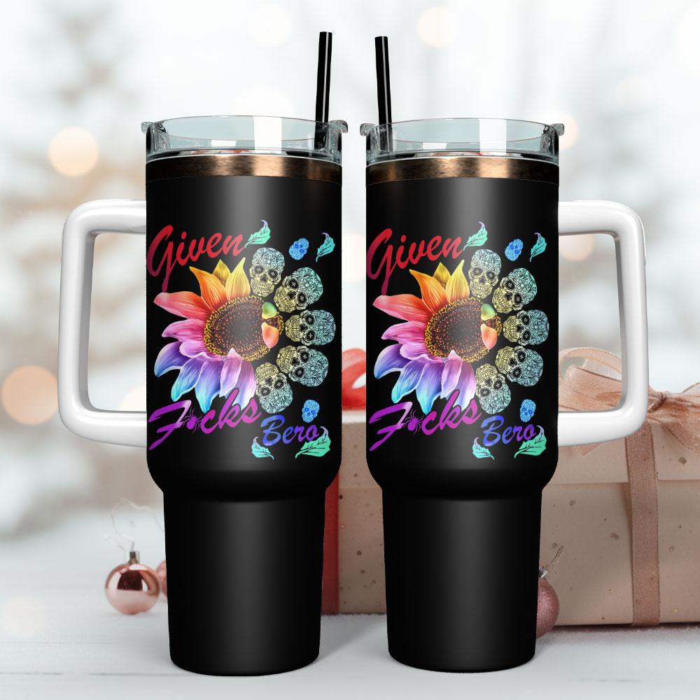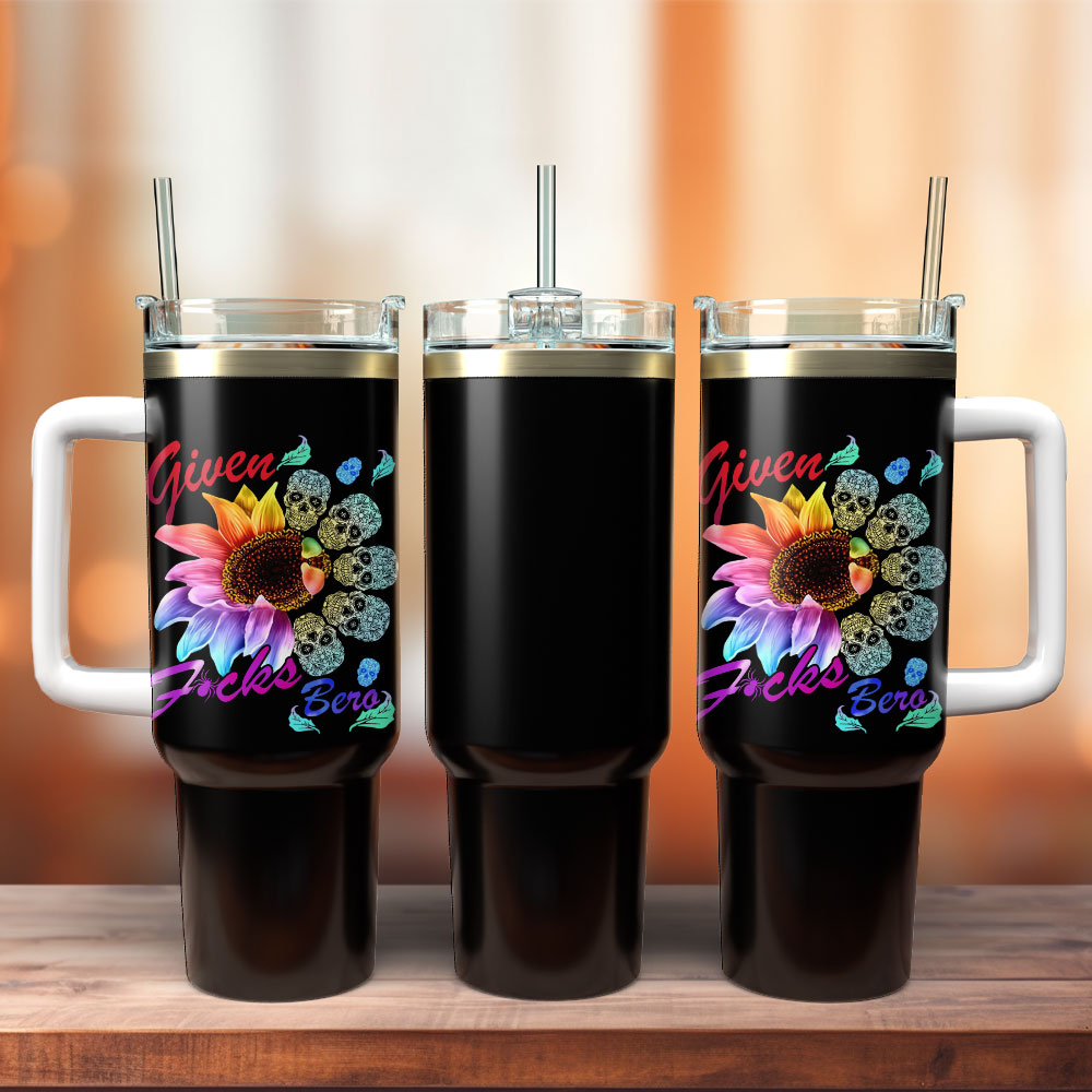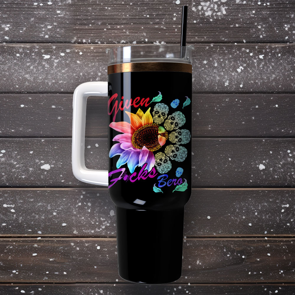 Stay stylish on the go with this durable travel mug featuring a bold sunflower and skull design. Perfect for keeping drinks hot or cold.