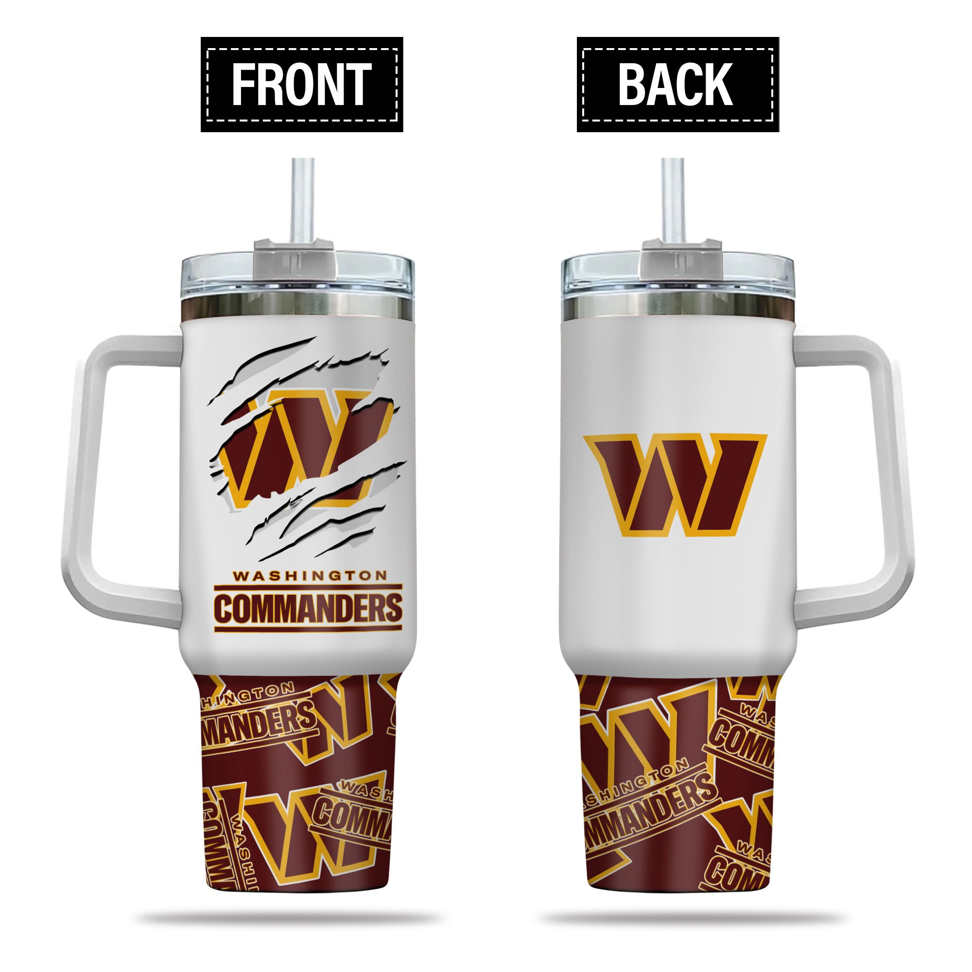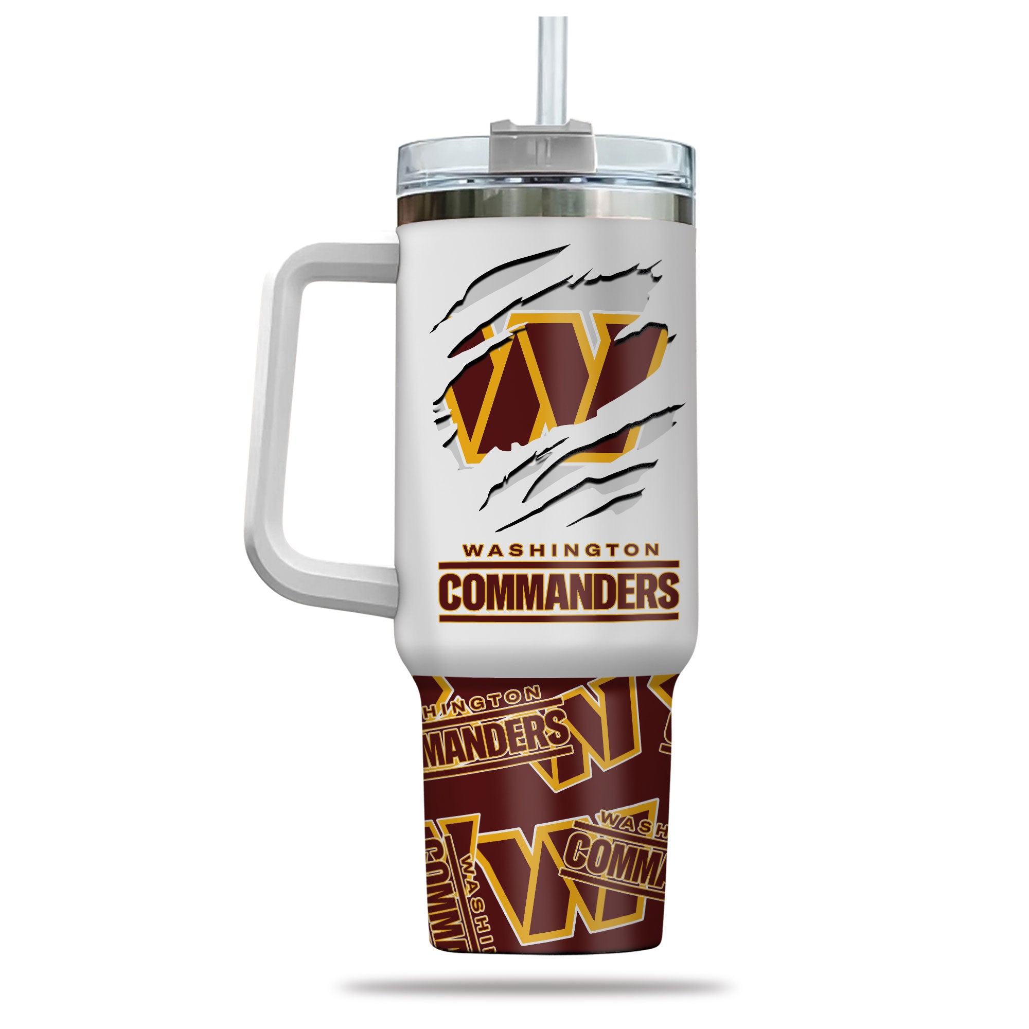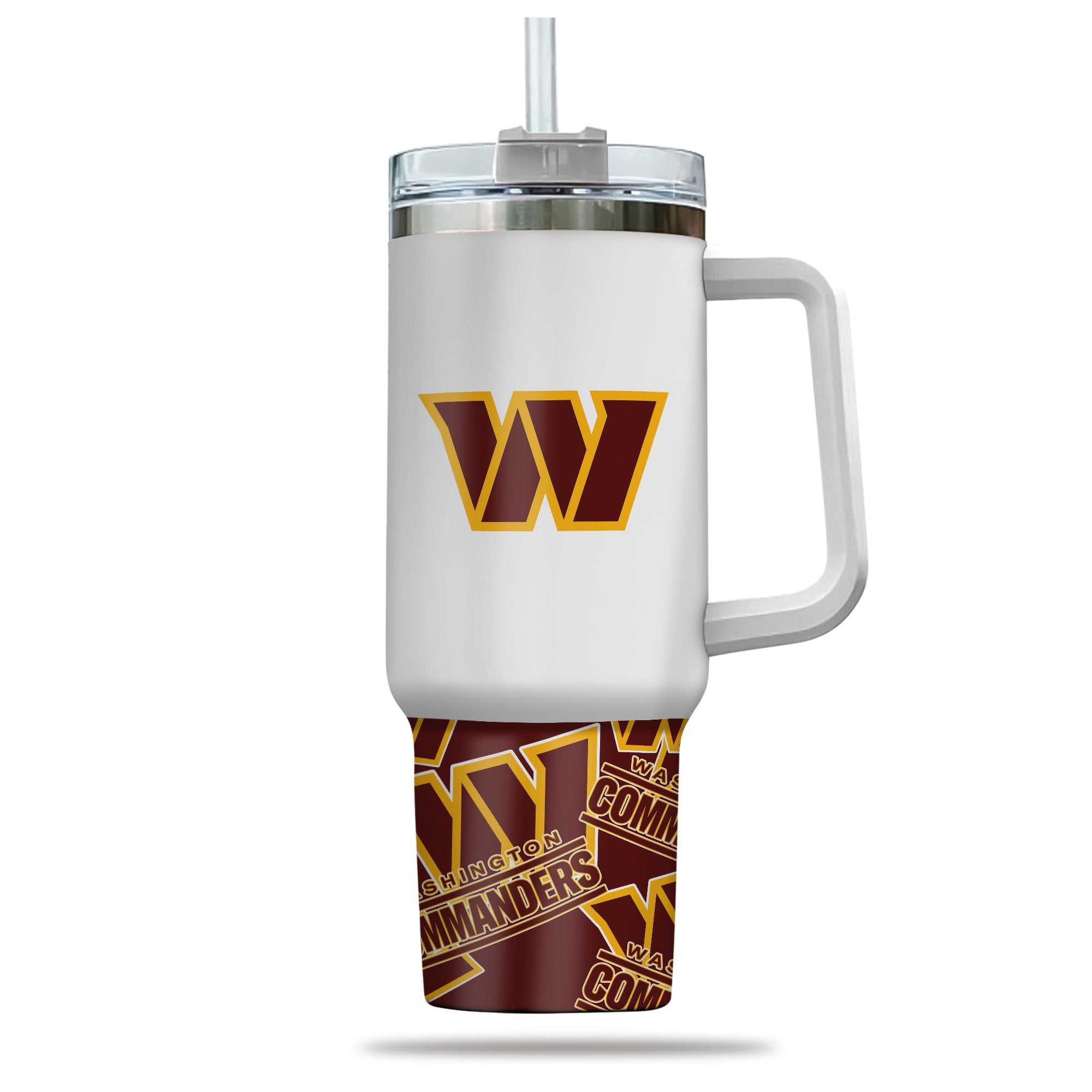 Show your team spirit with this Washington Commanders tumbler. Features a handle and straw, perfect for keeping your drinks hot or cold on the go.