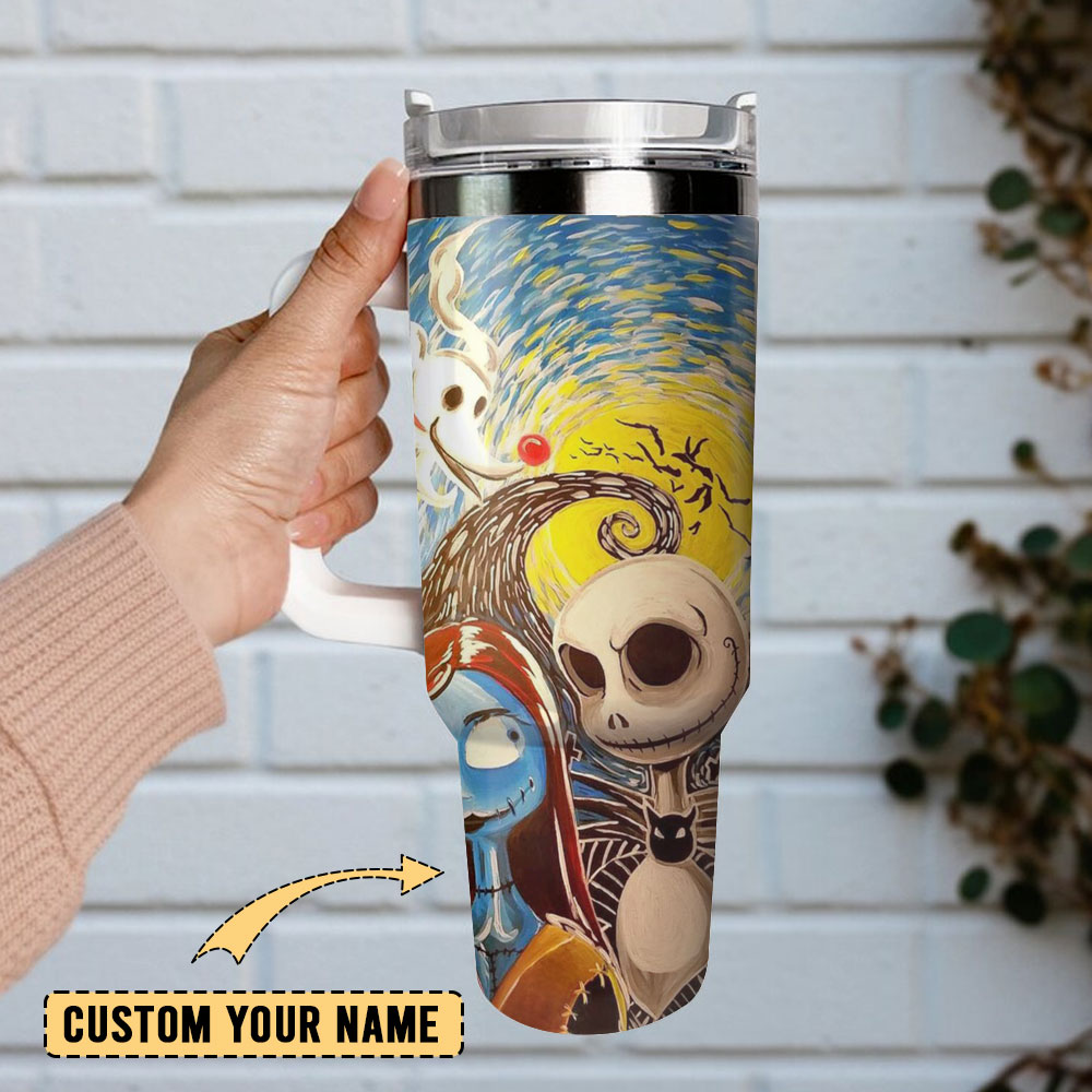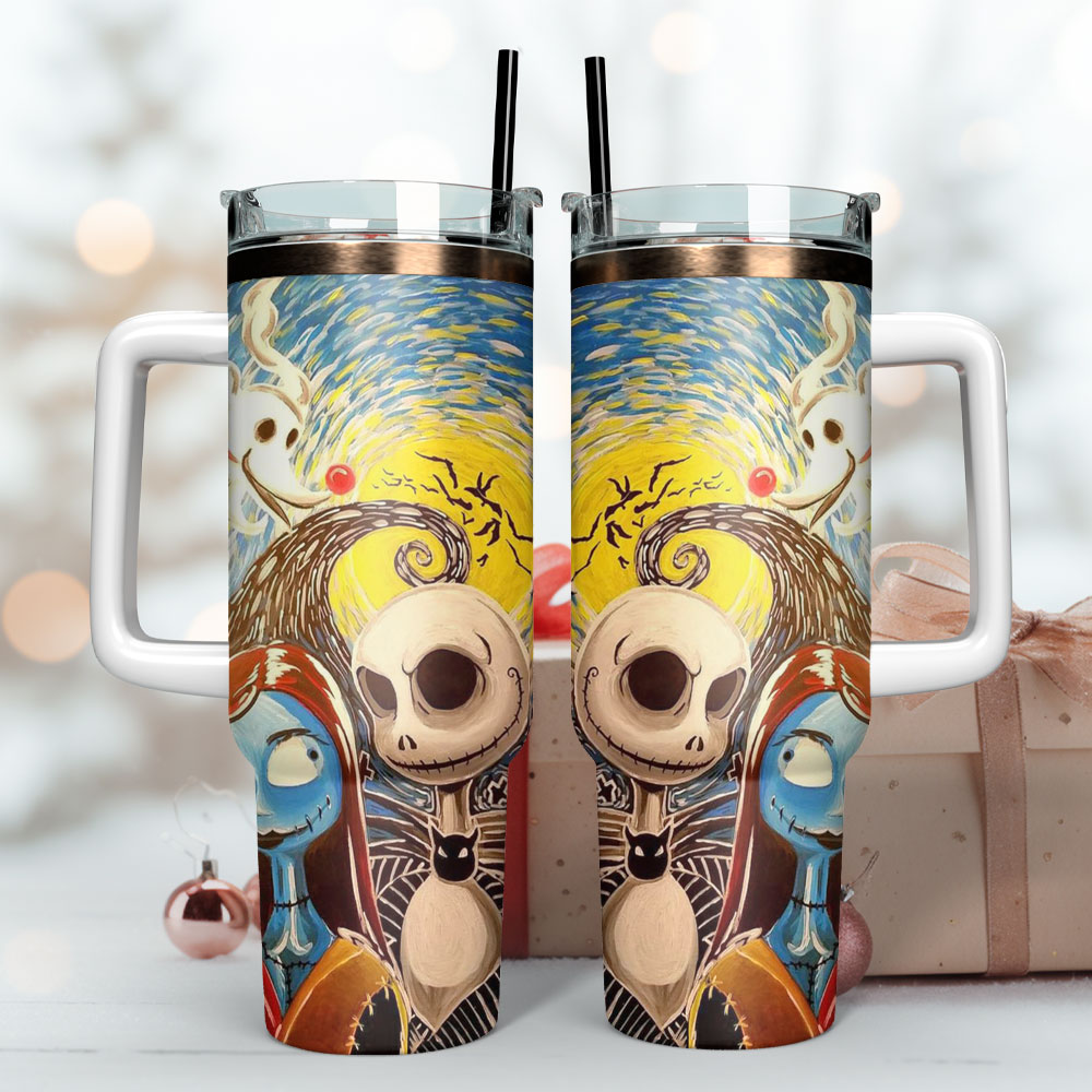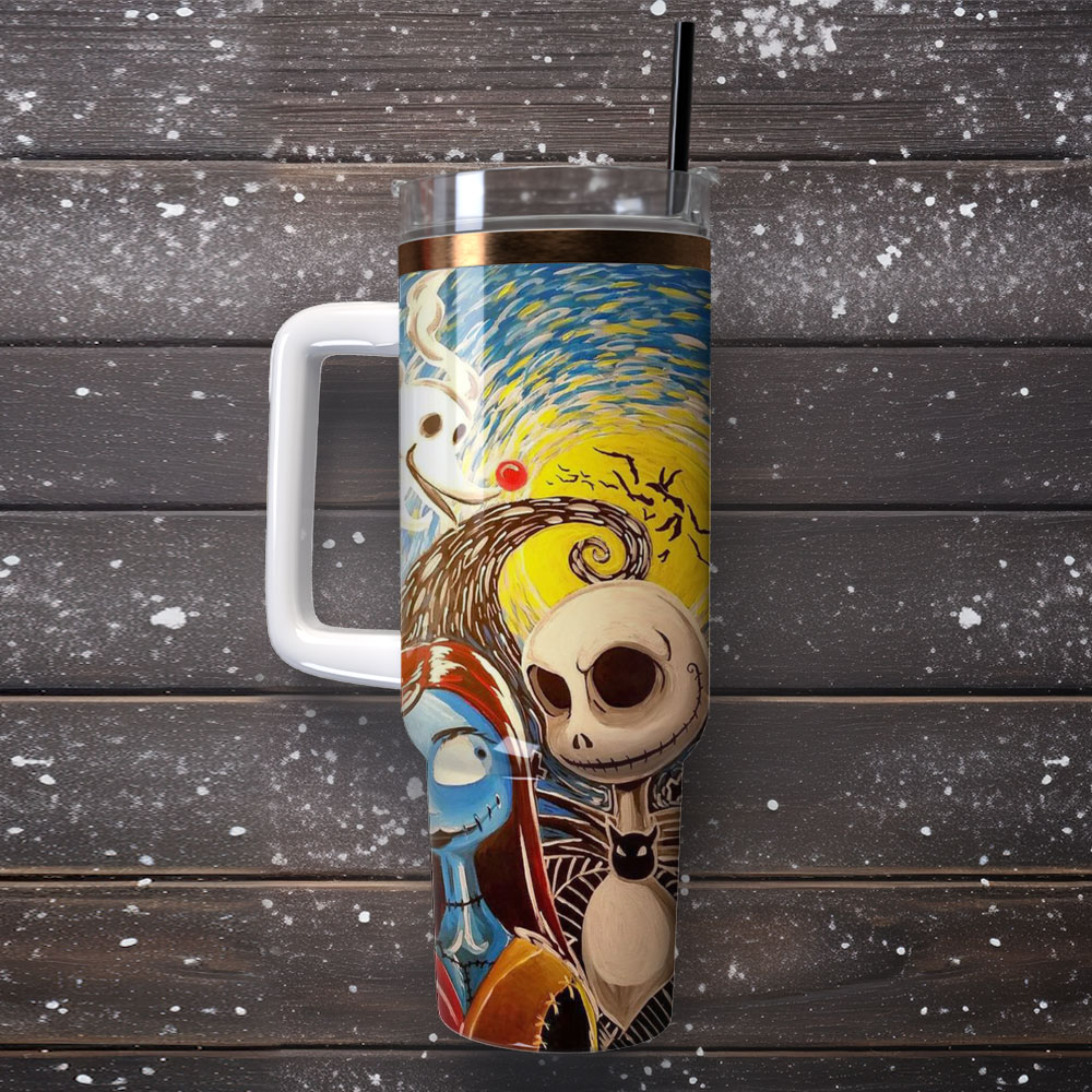 Whimsical Starry Night Skull Tumbler with Handle – 40oz Stainless Steel